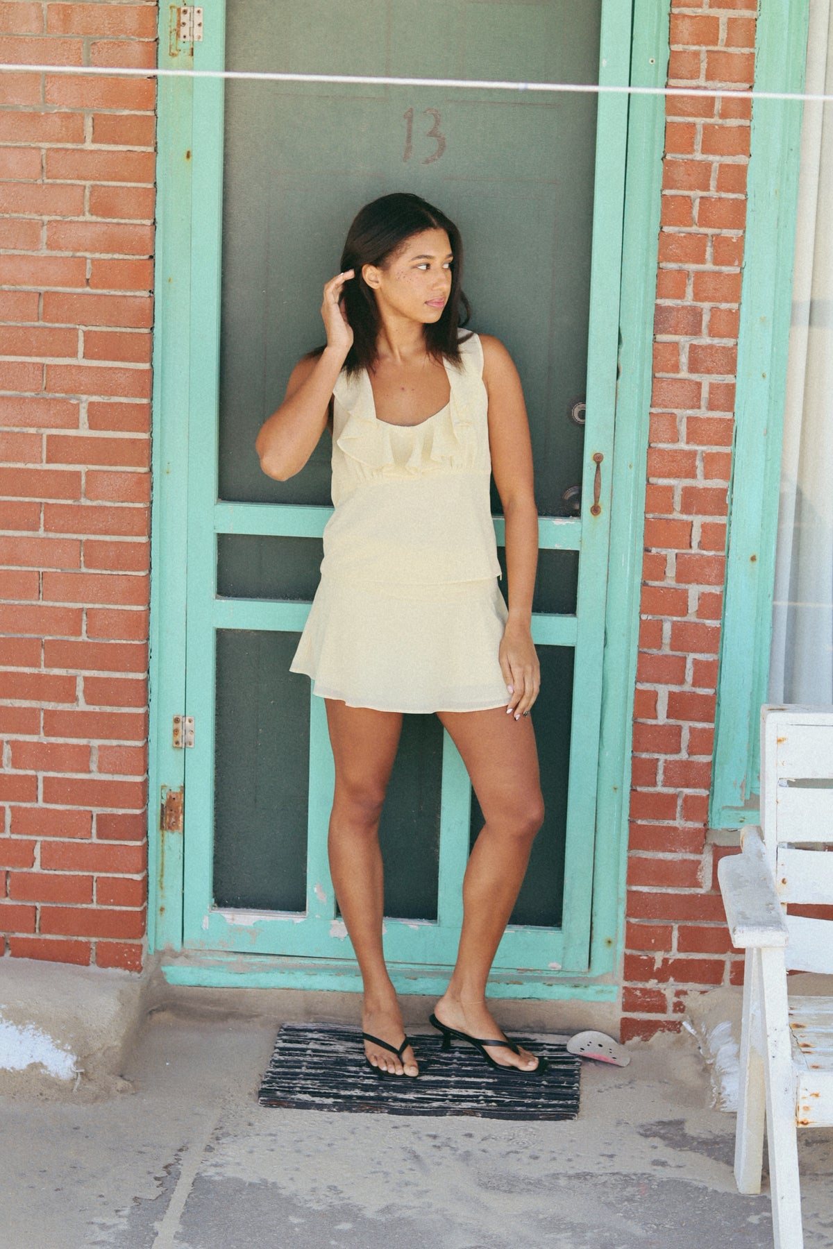 The Cassia Skirt captures a sense of airy refinement through its softly fitted mini silhouette. It features a ruched waistband with horizontal gathering that adds depth and texture, transitioning into a gently flared hem for subtle movement. Crafted from lightweight chiffon and finished with a discreet side zipper, this fully lined piece offers a polished, streamlined fit. Complete the look with the matching Verbena Top.
