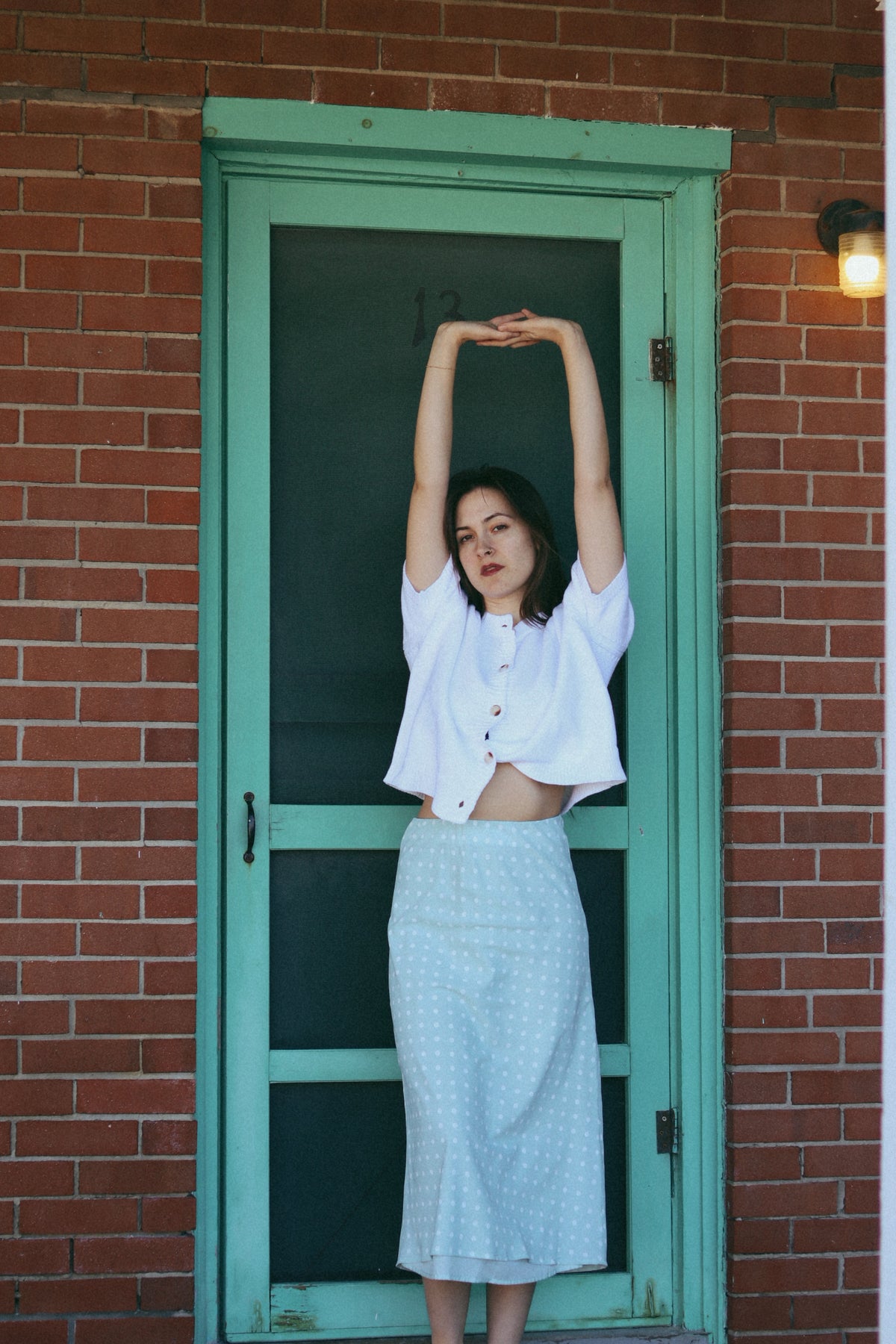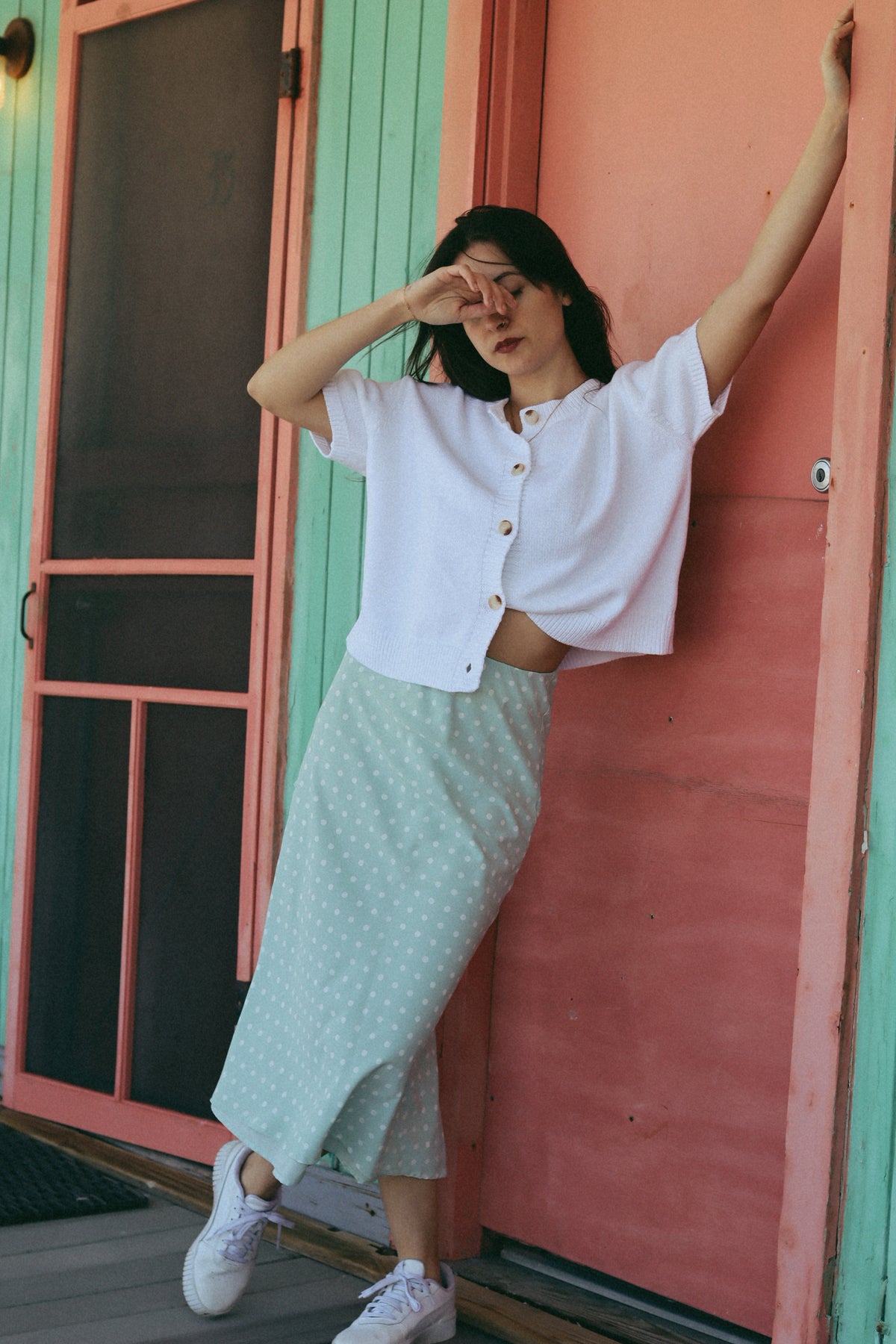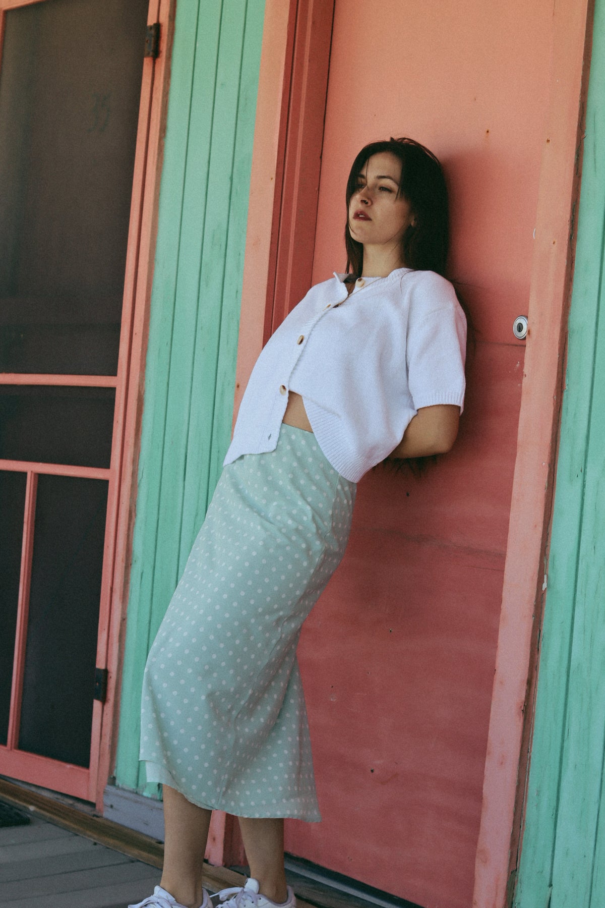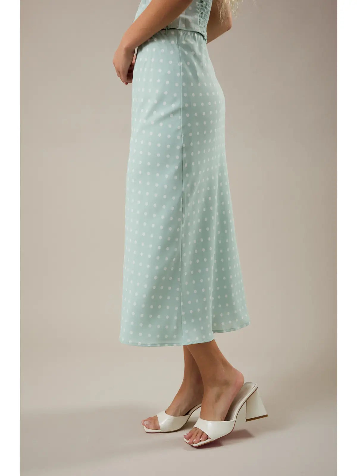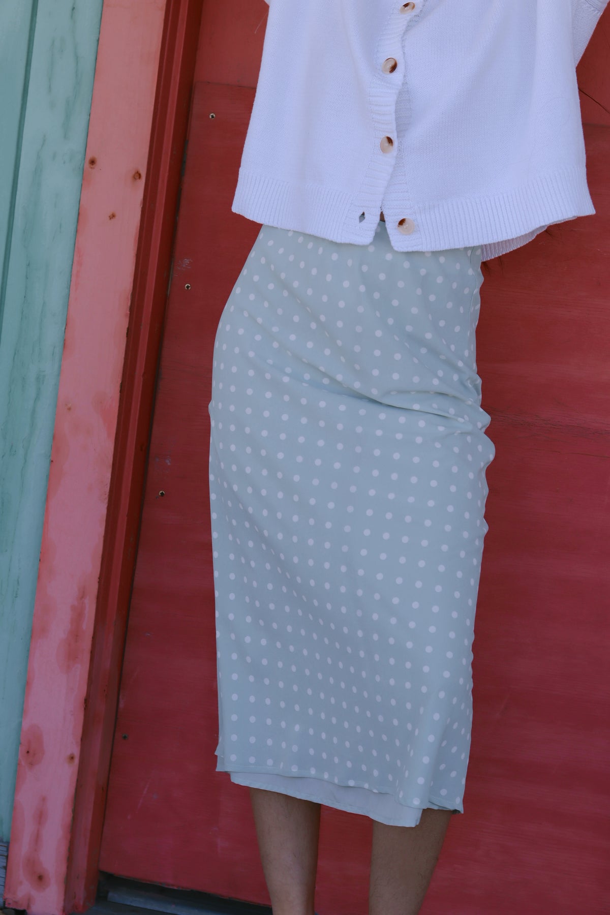 this polka dot mid rise skirt is a cute piece for spring! we love it with white on top or another matching blue.