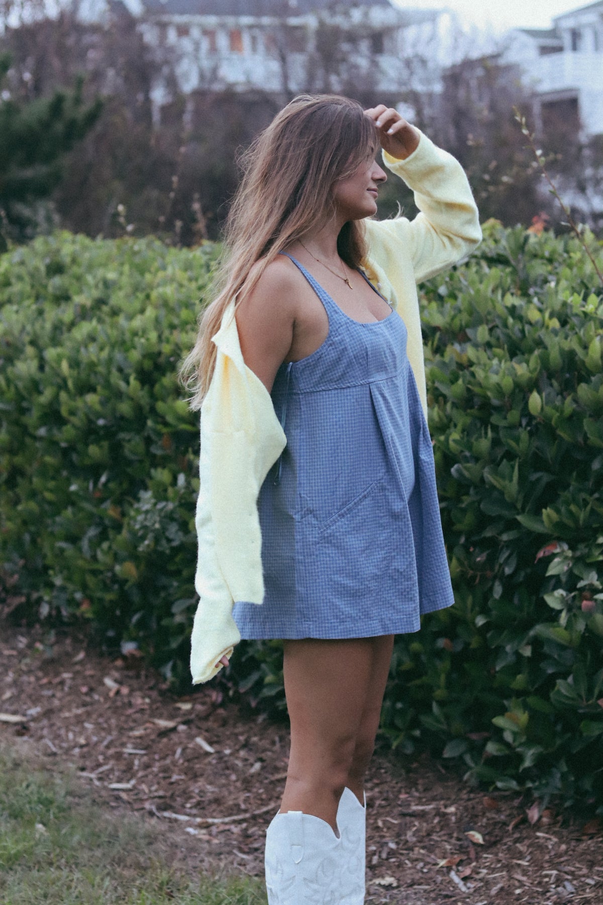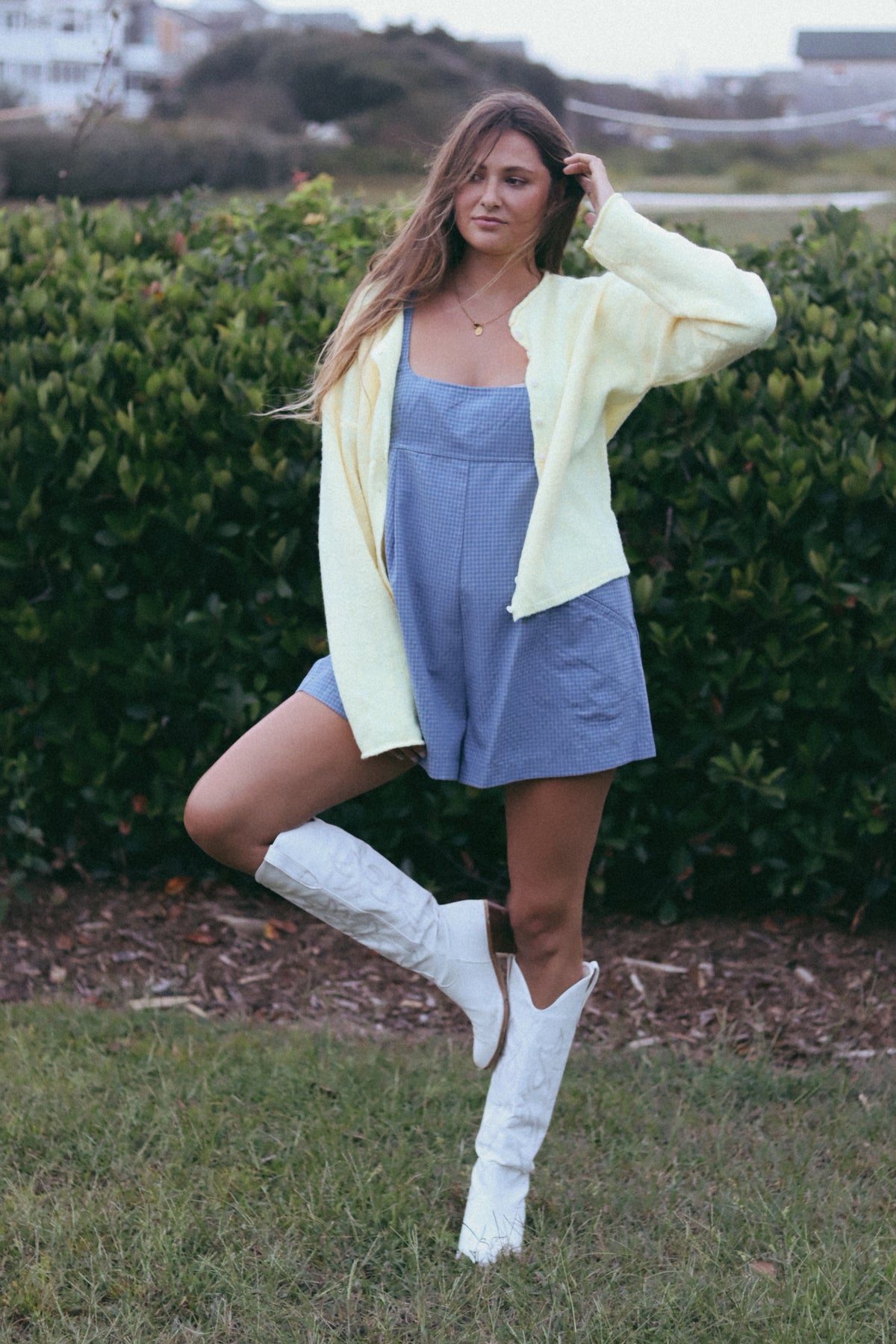 Our giddy up plaid romper paired with our fav little yellow cardi.