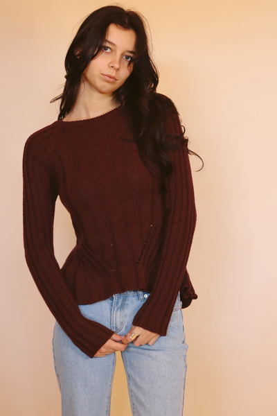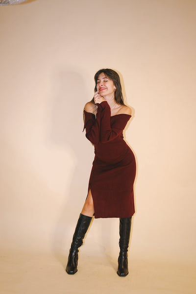 Off Shoulder Long Sleeve Knit Dress Maroon