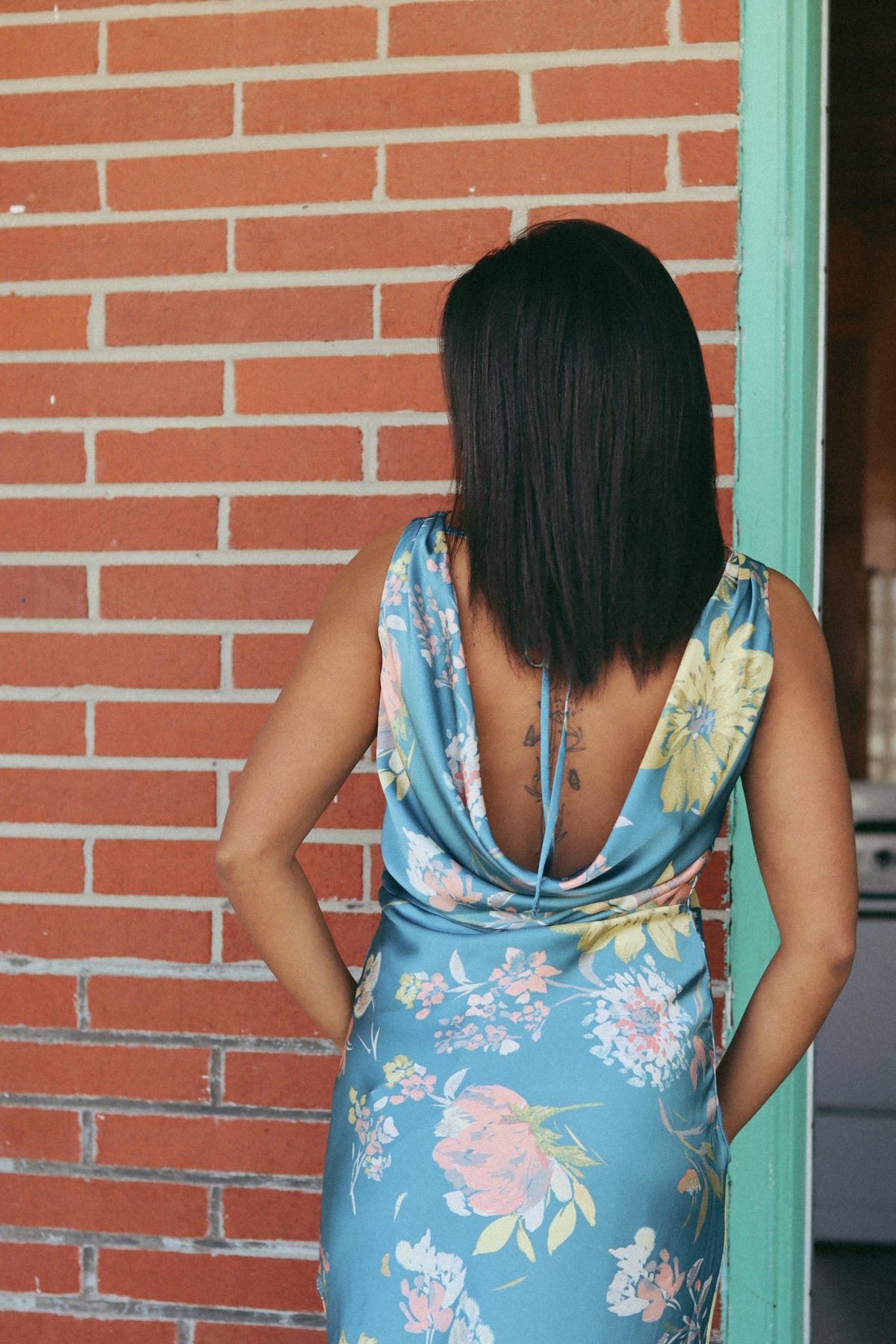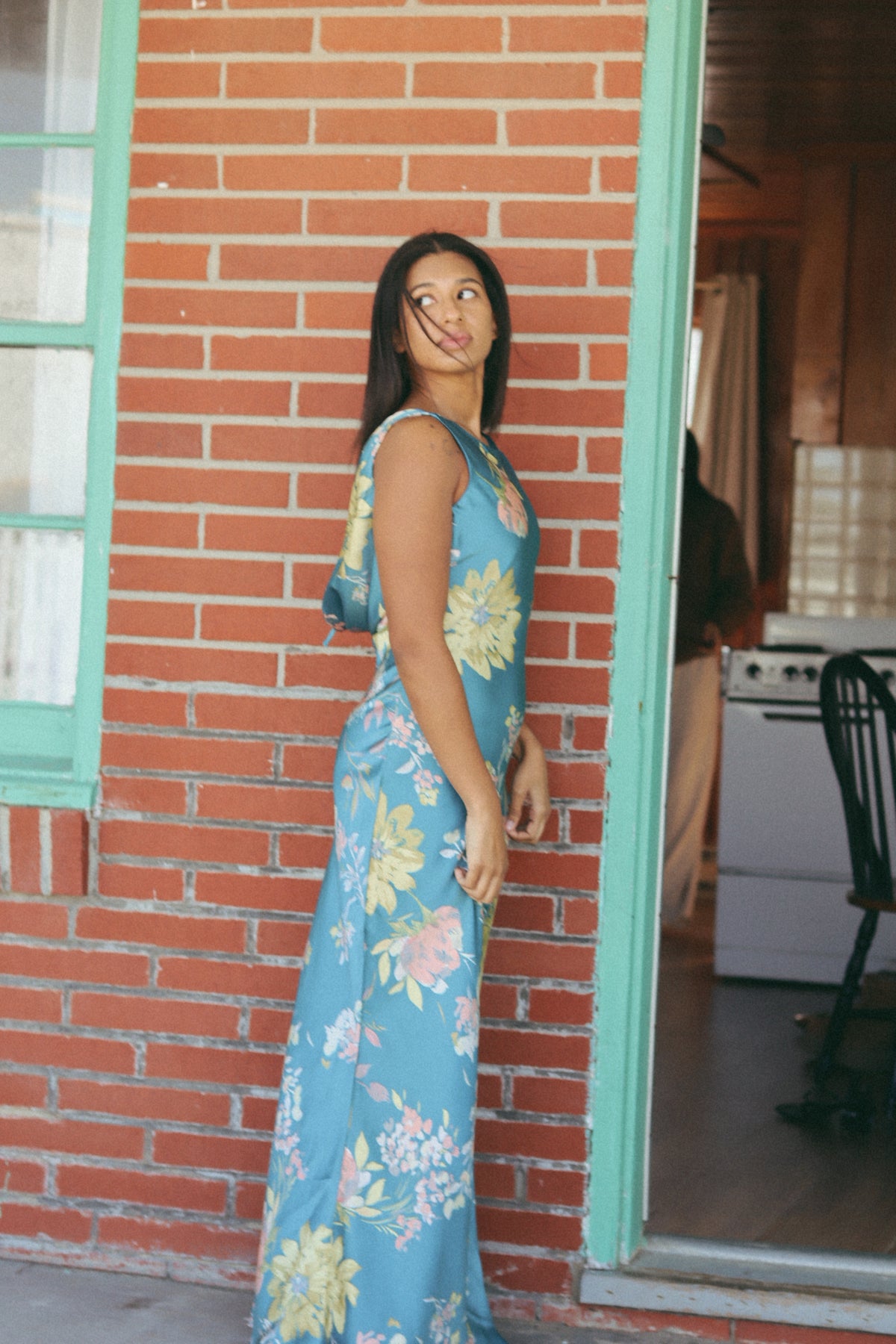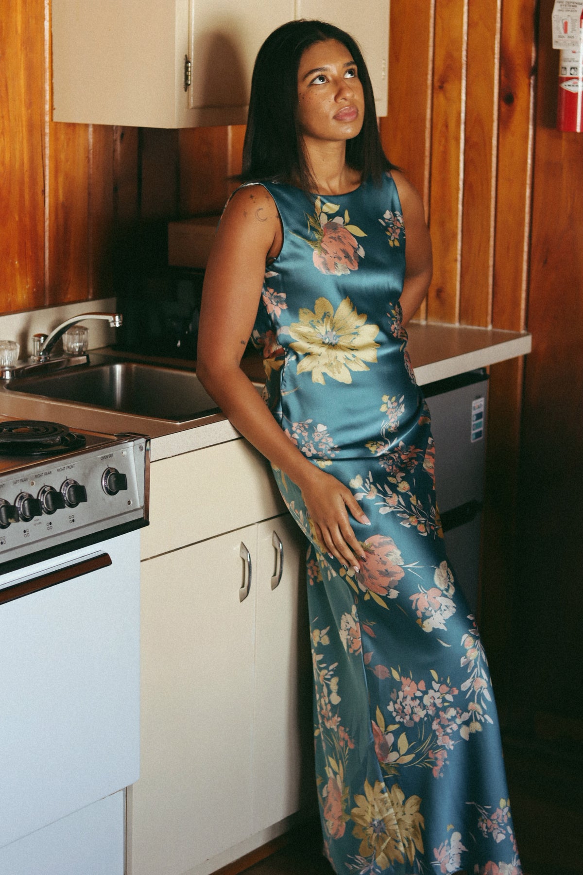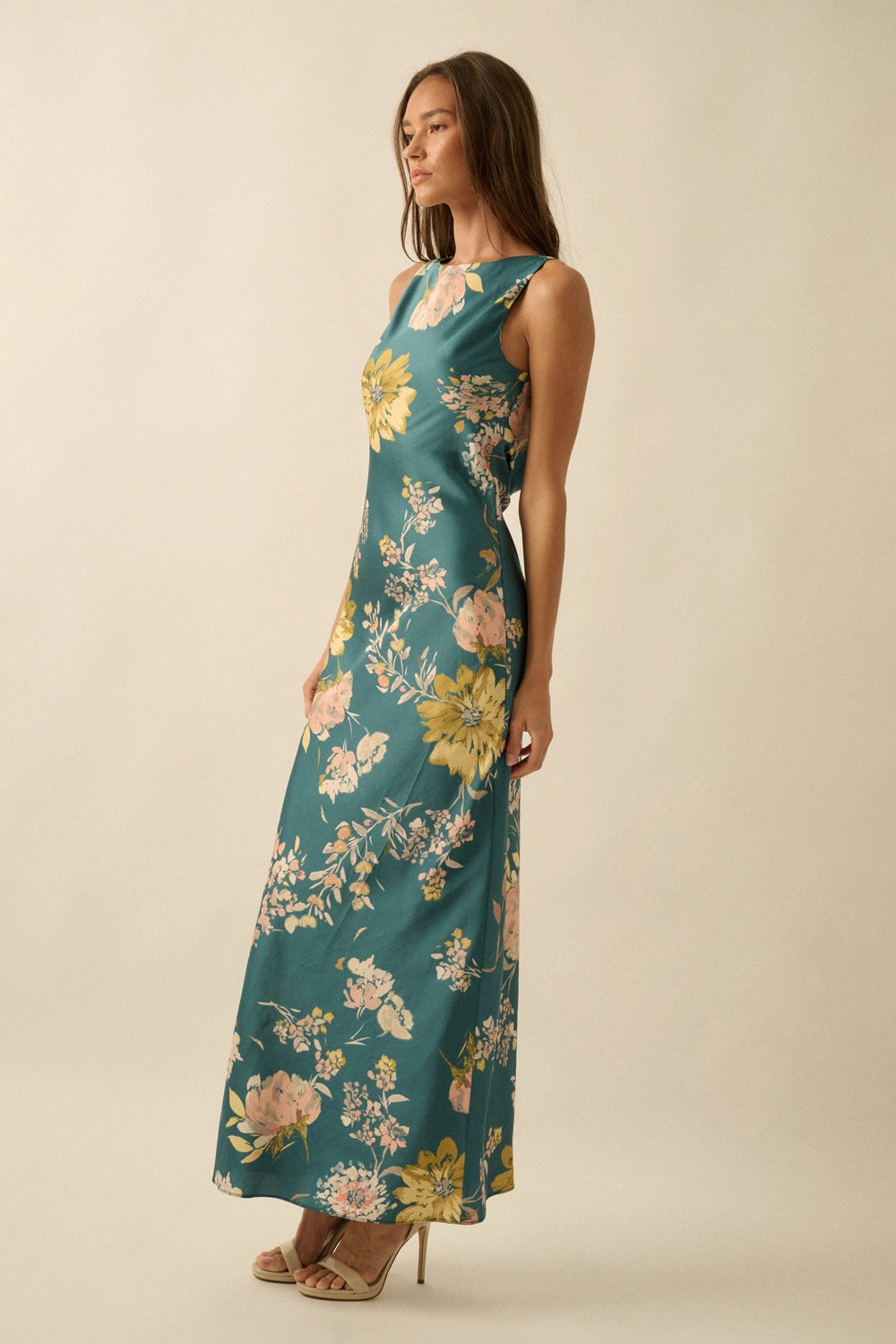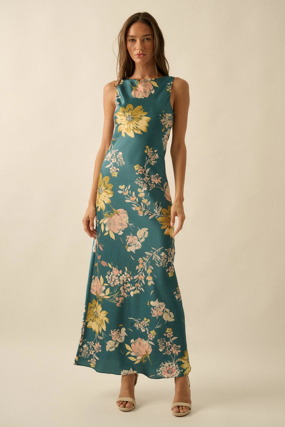 A floral-print satin maxi dress with the following features: Bias-cut fabric. Boat neckline. Sleeveless. Open cowl back with tie closure. Ankle length. Fitted silhouette. Model Info: Height: 5 ft 9 in | Bust: 32 in | Waist: 24 in | Hips: 36 in | Wearing Size S.
