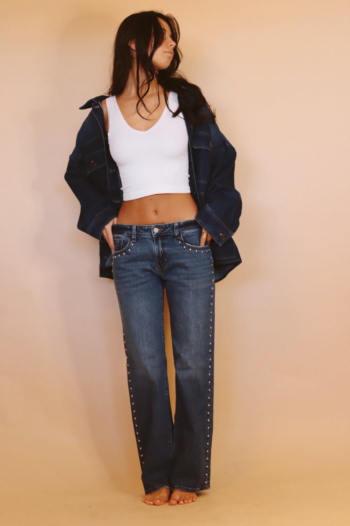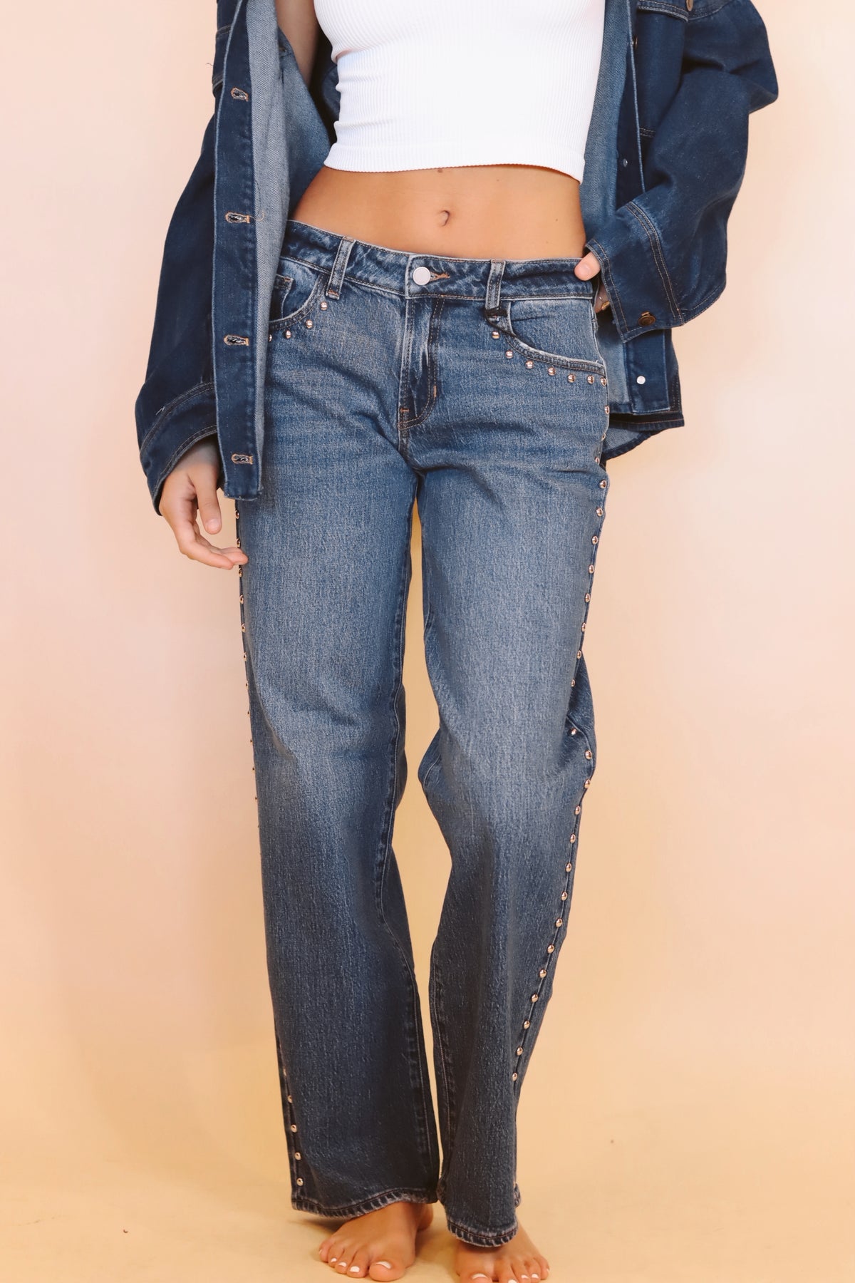 9'' RISE, 29'' INSEAM, 9.25'' OPENING Dark Denim - Low Rise Studded Baggy Jean 12 unit pre-pack: (1) 24, (1) 25, (2) 26, (2) 27, (2) 28, (2) 29, (1) 30, (1) 31