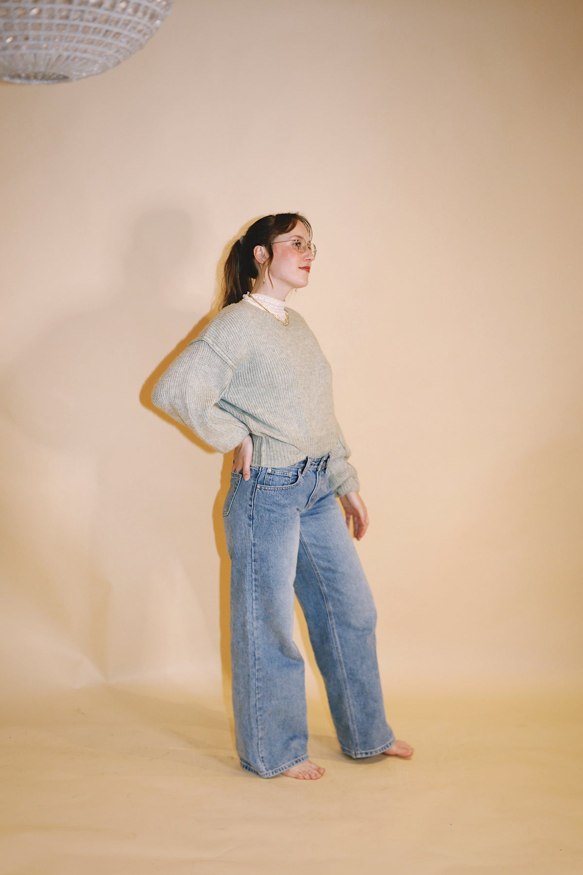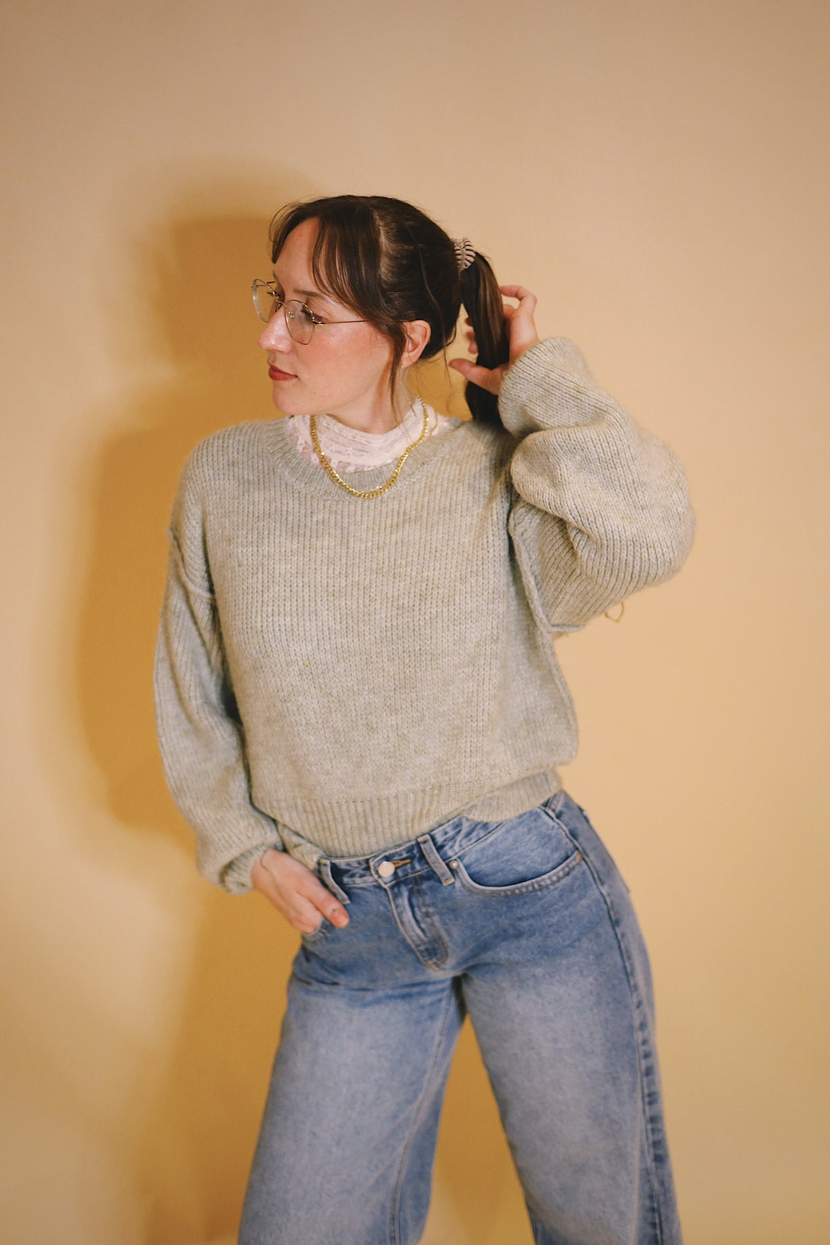 A solid knit sweater with a round neckline and drop shoulder. Fits true to size, model is wearing size small.