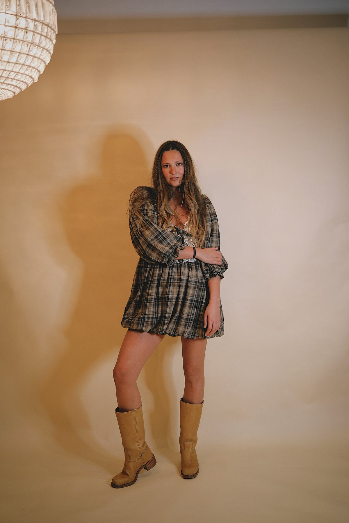 Plaid and Lace Puff Sleeve Mini Dress