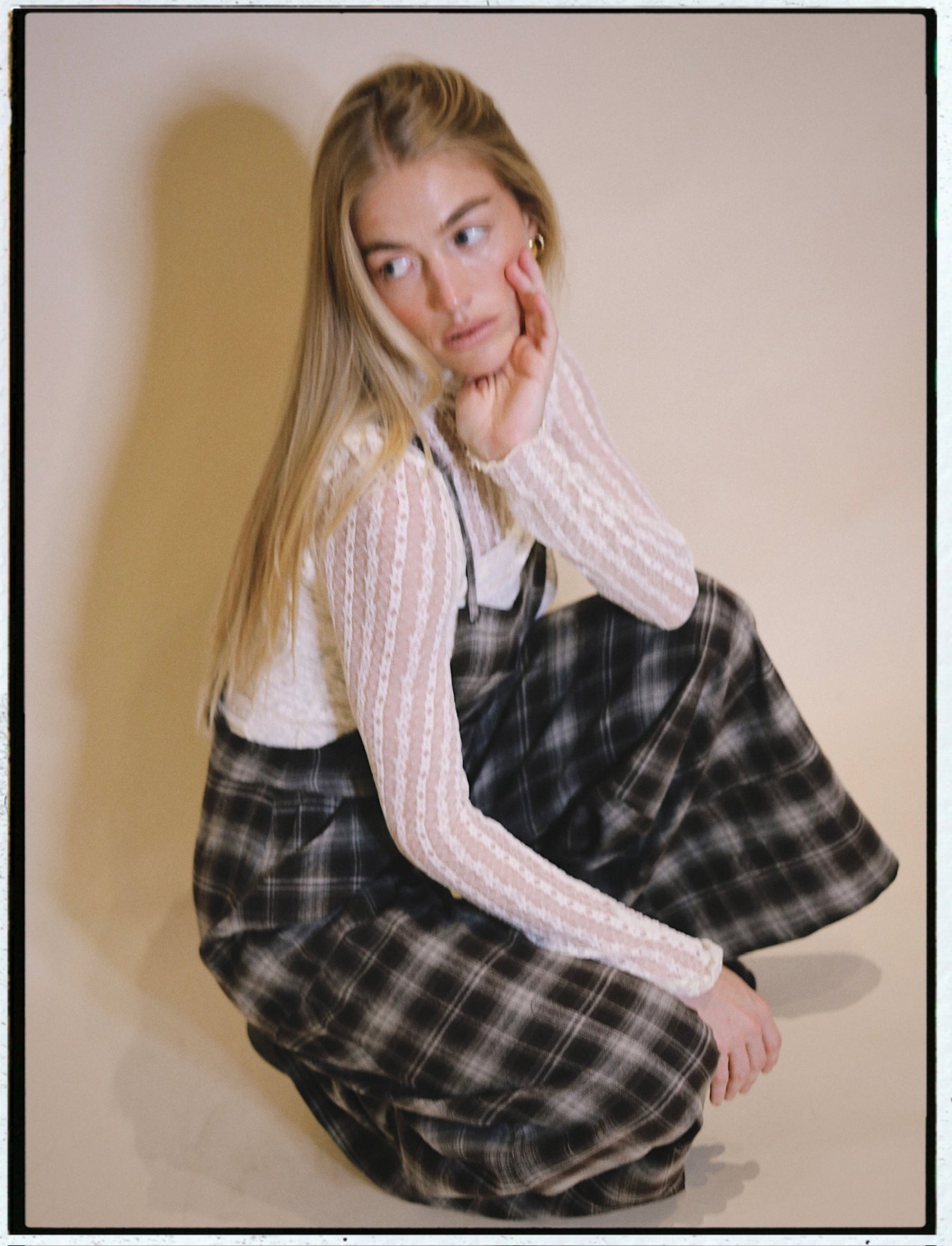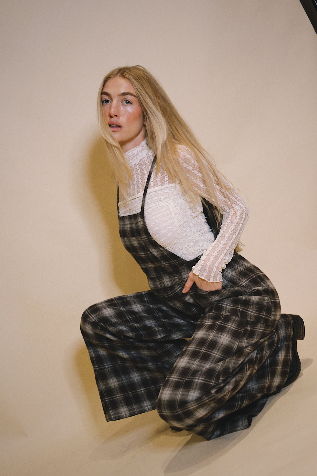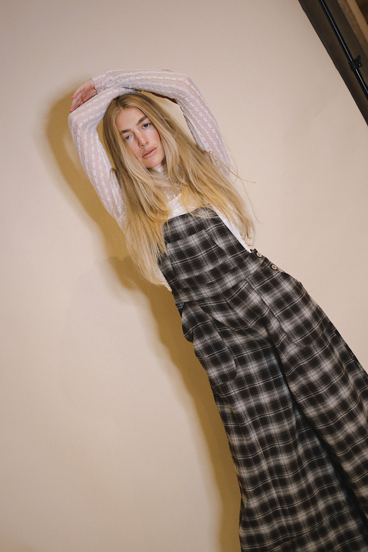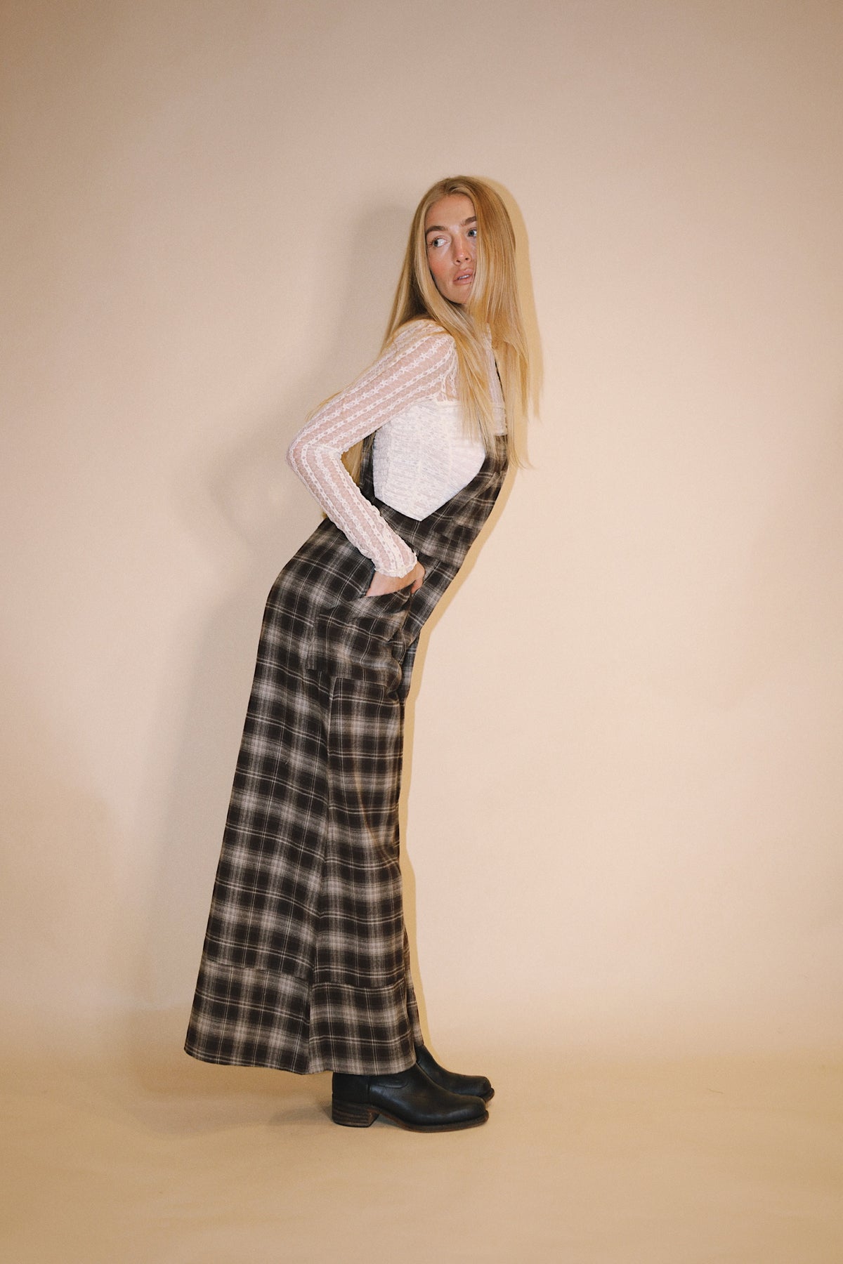 A plaid flannel overall jumpsuit with the following features: Bib front with large pocket. Adjustable shoulder straps. Sleeveless. Side-button closure. Hip pockets. Wide-leg bottom. Low back. Relaxed fit.