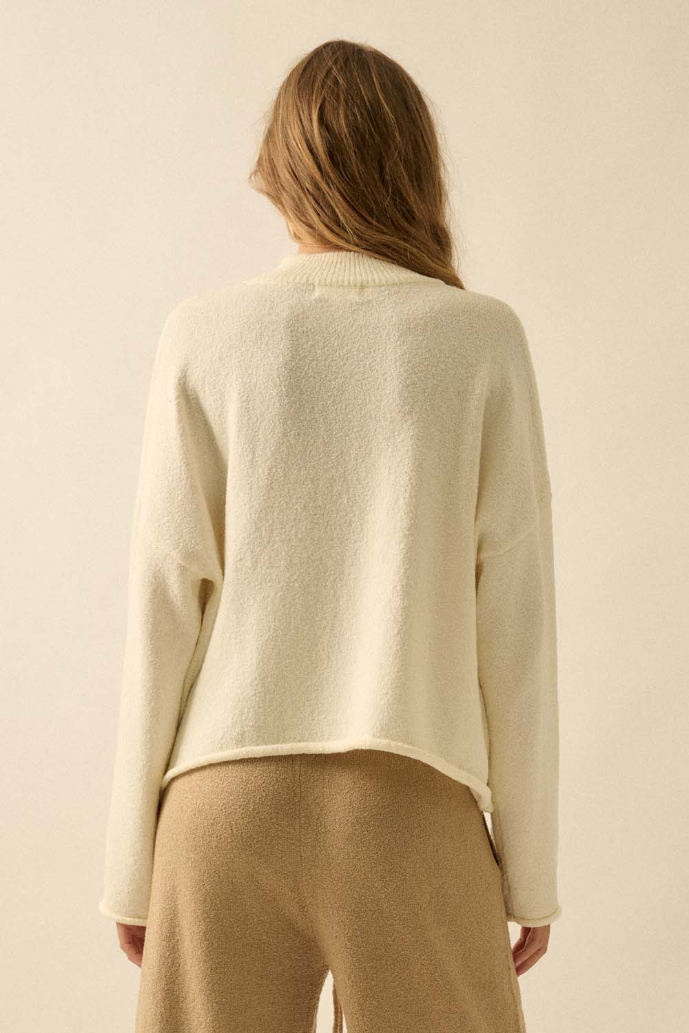 A solid, textured knit sweater with the following features: High mock neckline. Half-zip front closure in contrasting color. Long sleeves with contrast stripe. Drop shoulder. Ribbed knit collar. Rolled cuffs and hem. Loose fit.