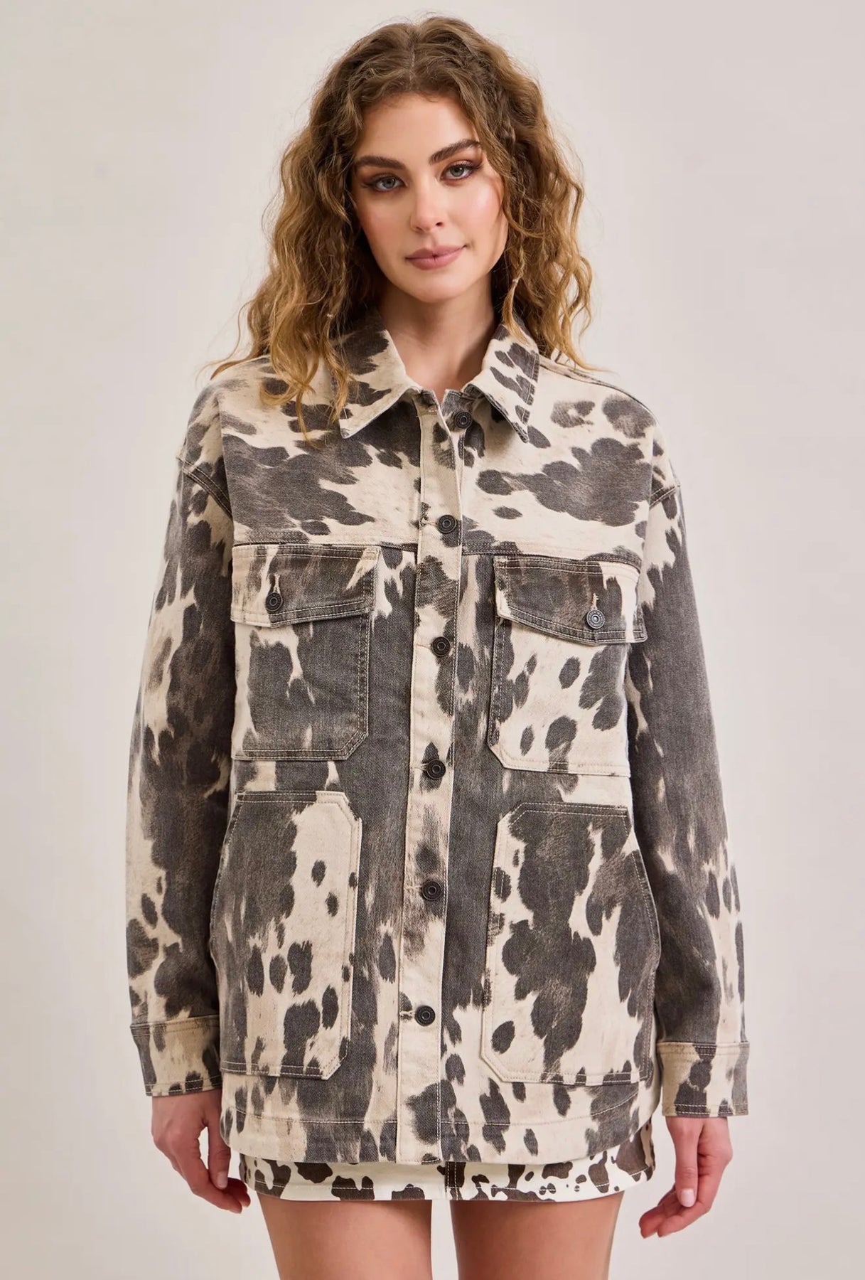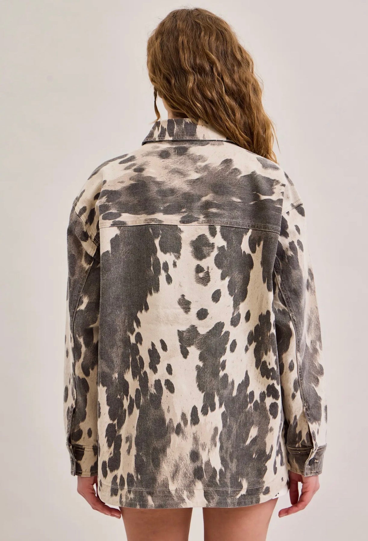 Moooooove over other animal prints — cow print is having her moment. this shocker runs oversized. Model is wearing size small