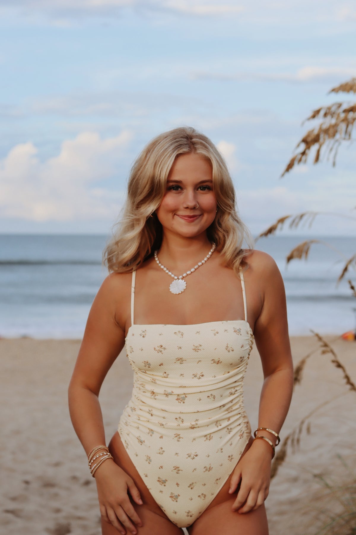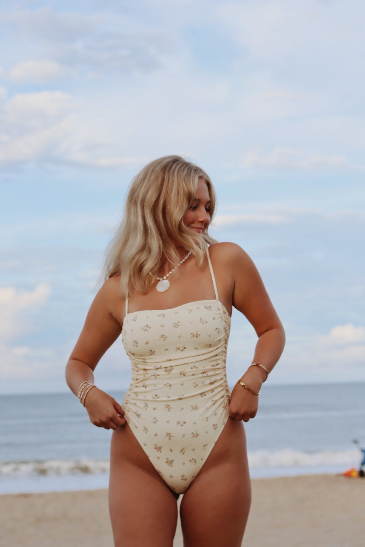 The Dahlia Floral Scrunched Side One Piece in Lemon flatters with its square neckline, adjustable straps, and side scrunch details. Designed for A-C cup sizes, this textured floral swimsuit is a playful yet sophisticated beachwear staple.