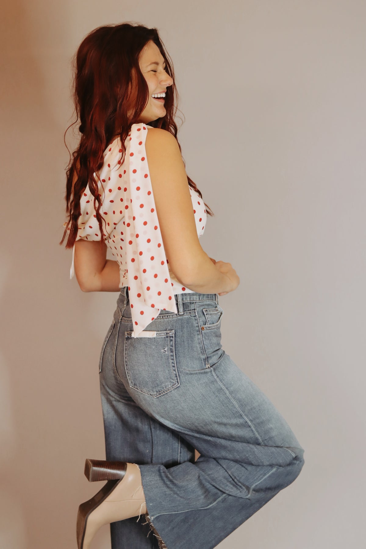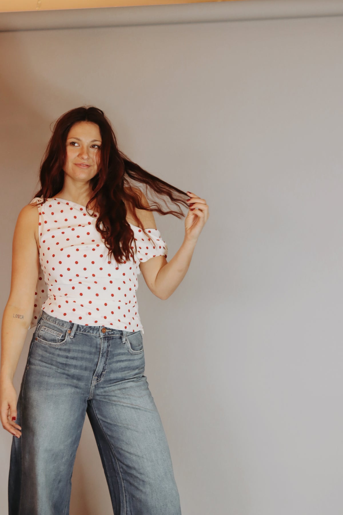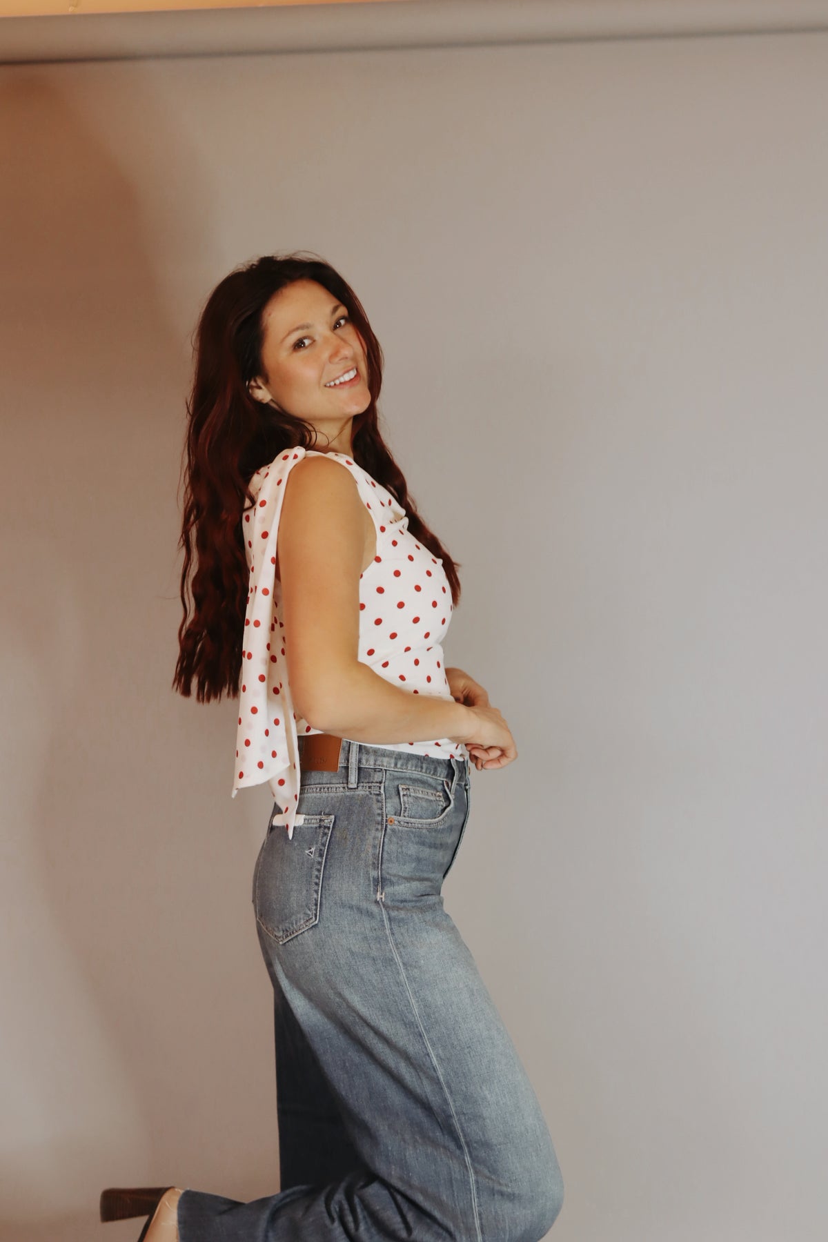 Celestine Dot Top This satin asymmetrical top drapes effortlessly across the shoulder for a modern, sculptural silhouette. Cut in a creamy base with vivid red polka dots, it features soft ruching through the bodice and a side tie detail with elongated sash ends for fluid movement. A smooth, fitted shape keeps it refined.