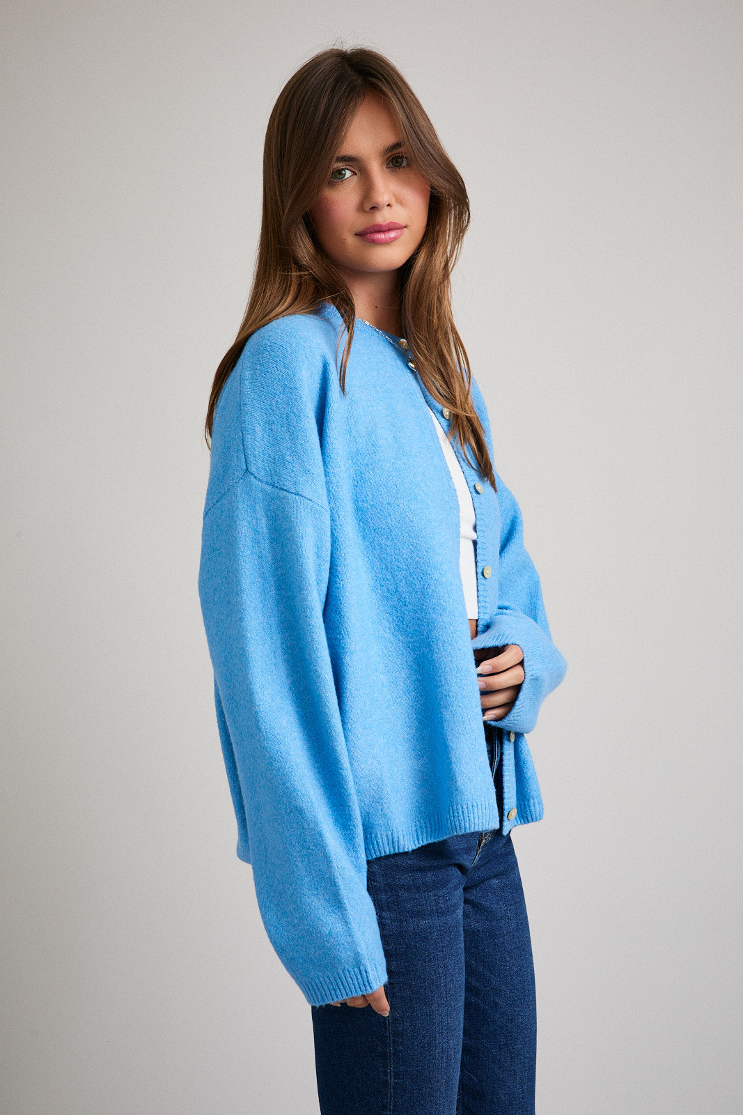 Our best selling cardigan style in a new pretty blue. We love this style paired with denim, unbuttoned or buttoned up.