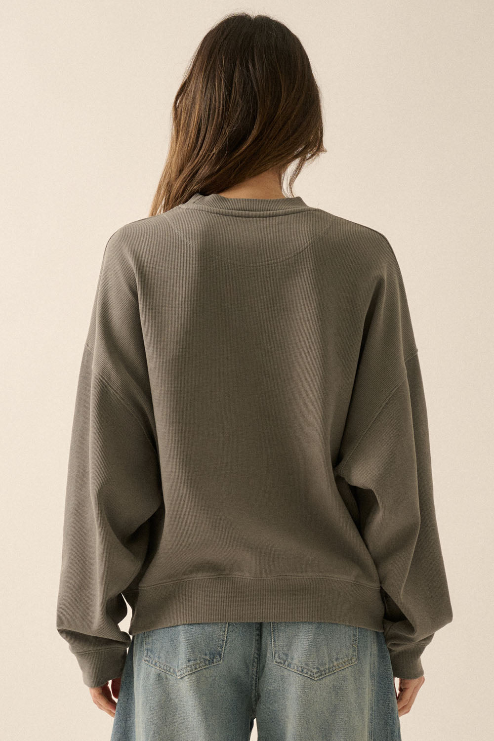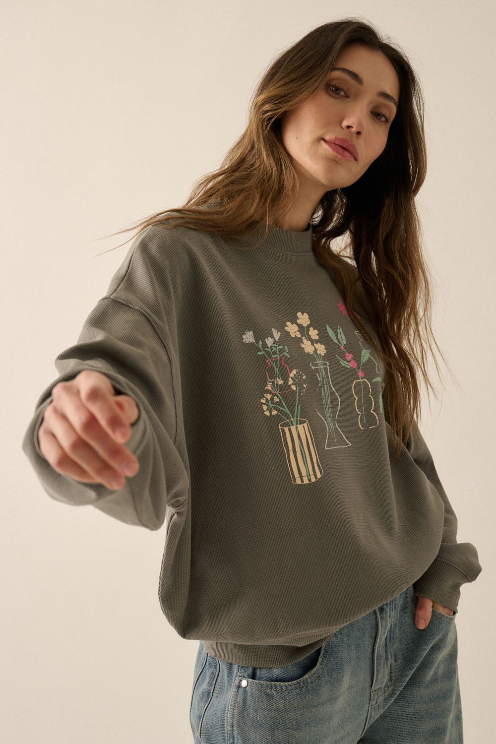 A waffle-knit thermal graphic top with the following features: Vintage-style floral vases graphic print. Crew neckline. Long sleeves. Drop shoulder. Banded neckline, cuffs, and hem.