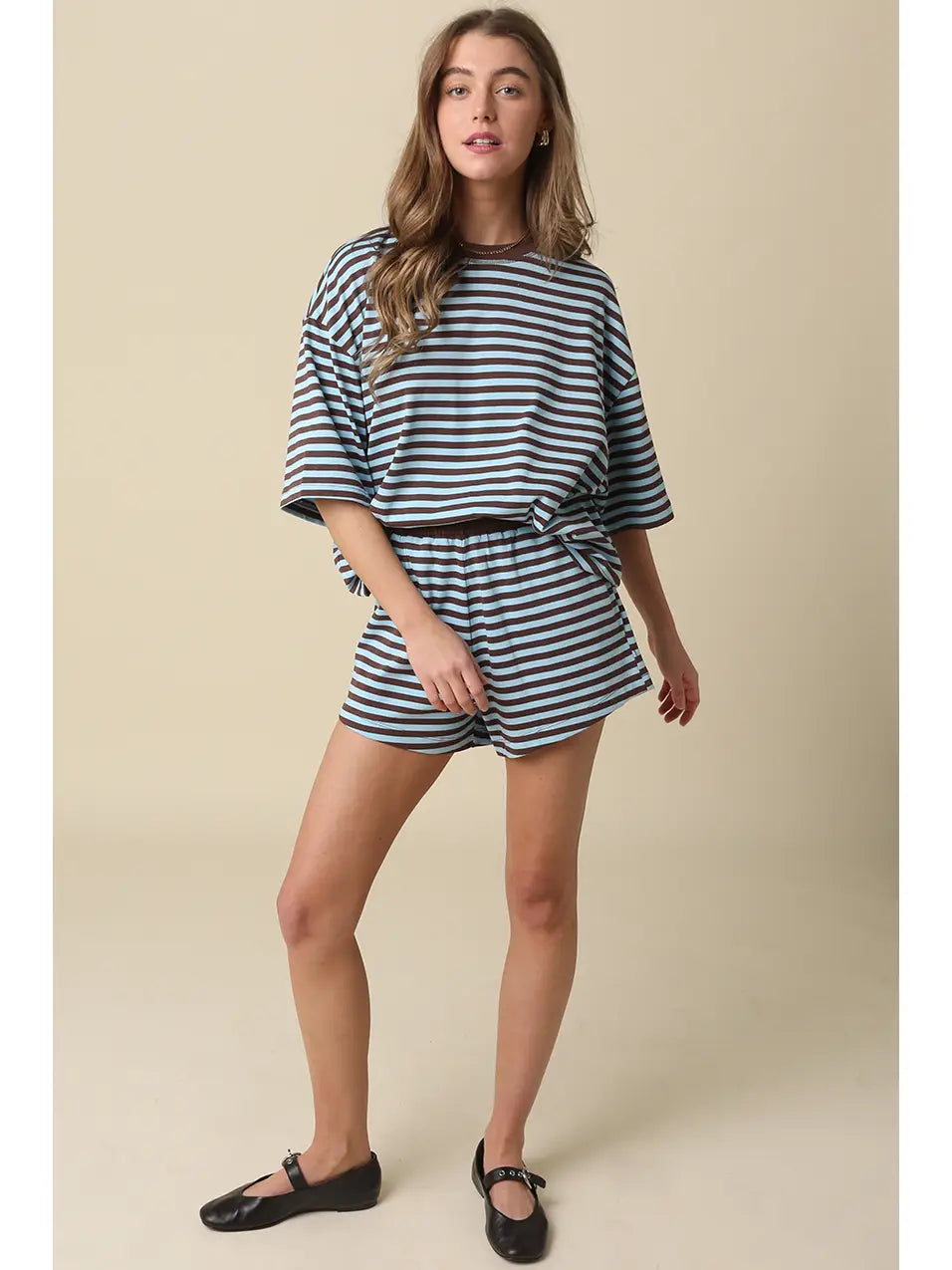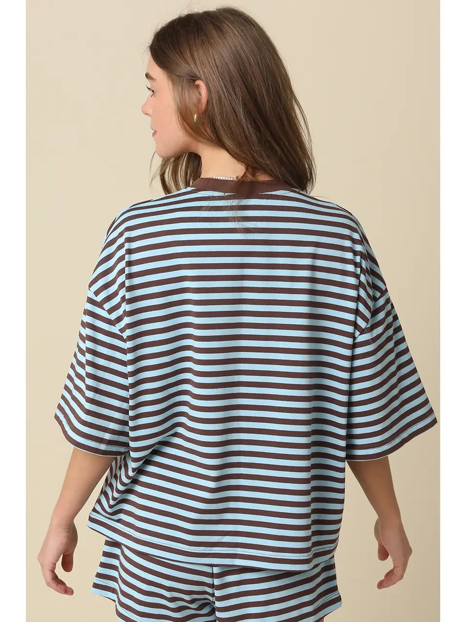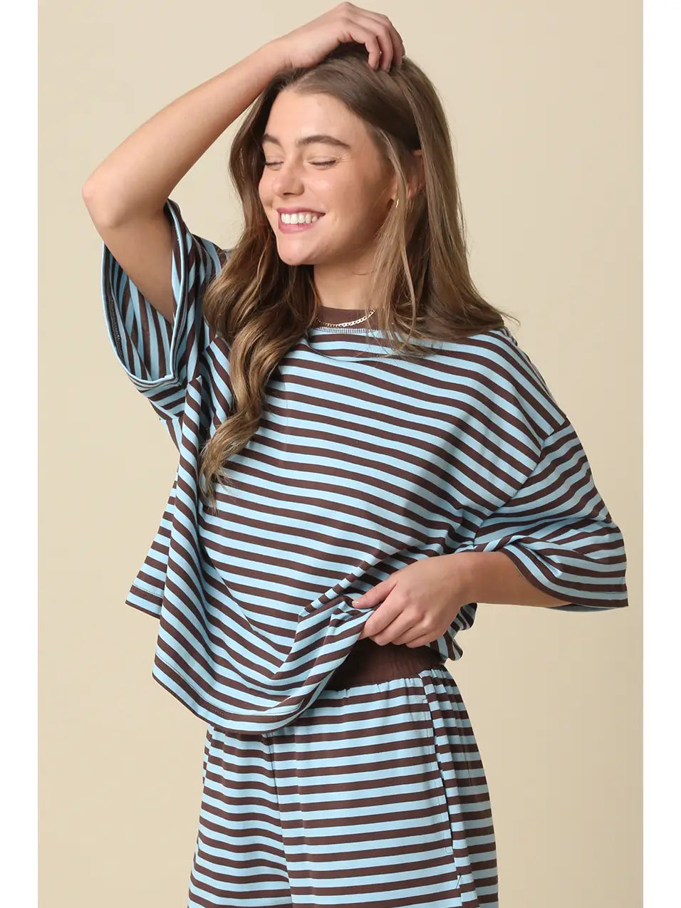 Our Lena Striped Relaxed-Fit Top features a soft crew neckline with an oversized, boxy silhouette and a horizontal stripe pattern with dropped shoulders for a laid-back fit.