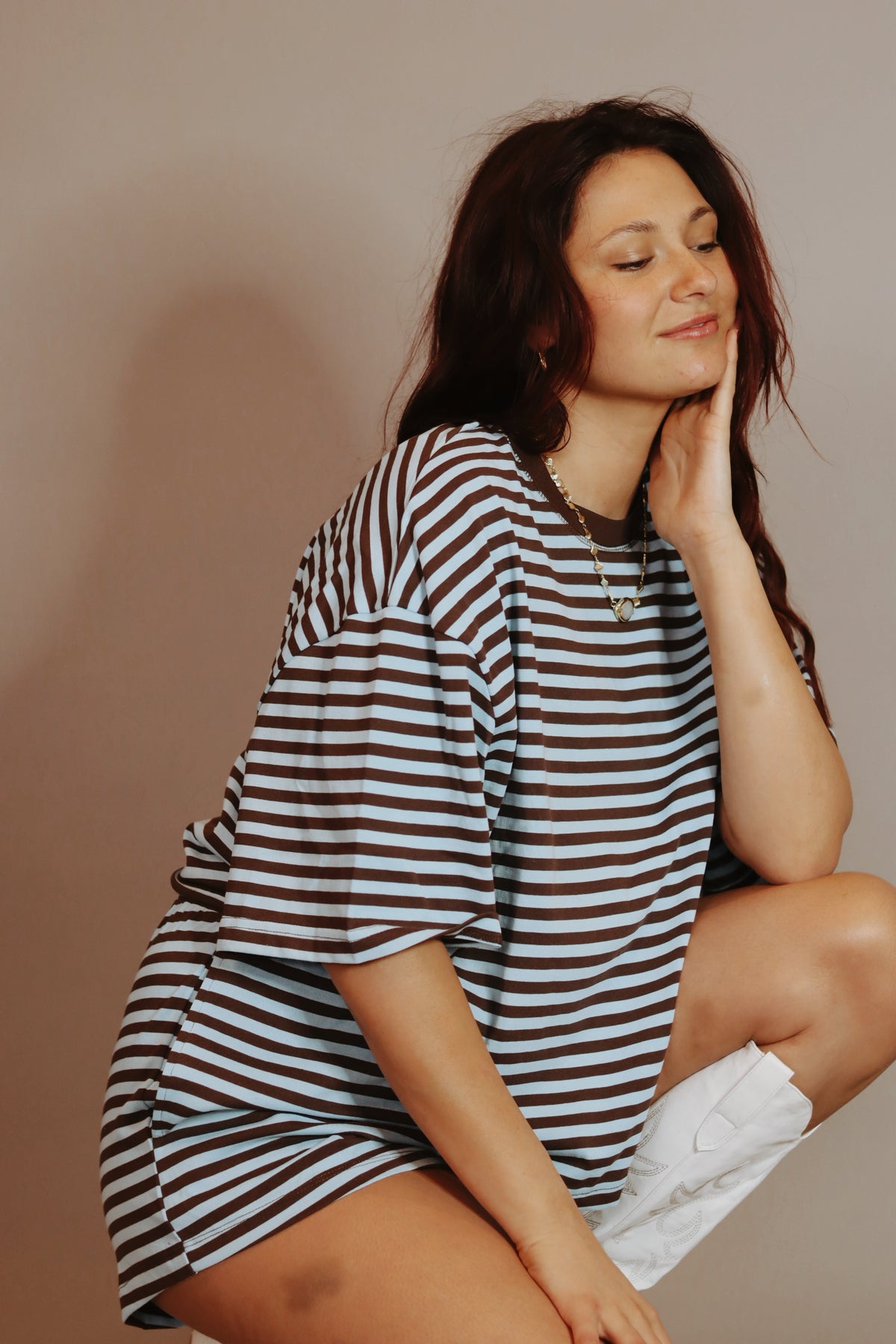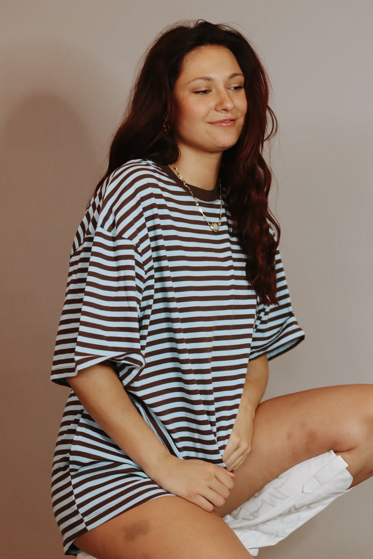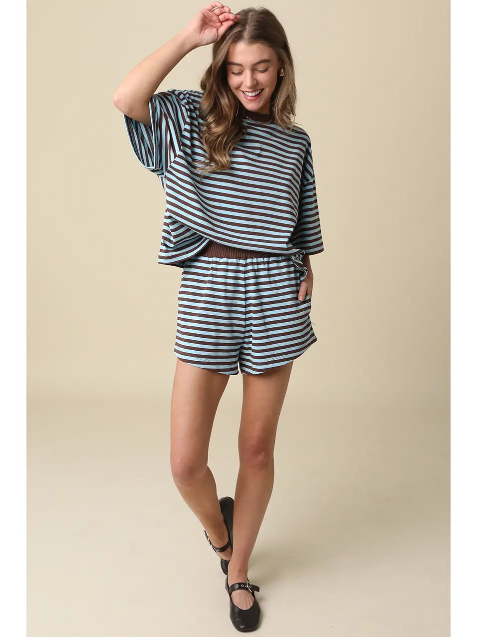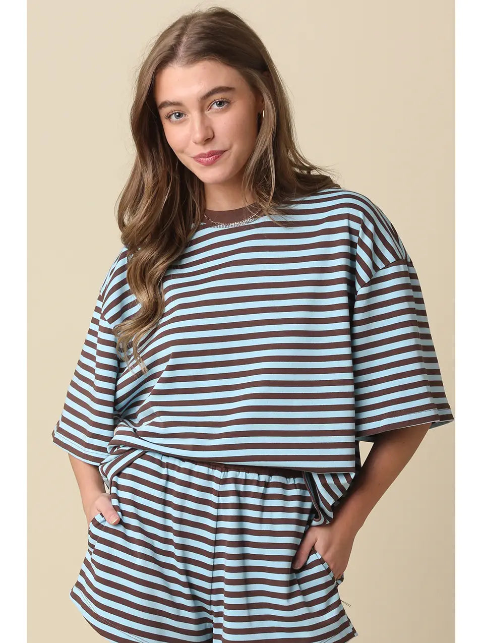 Our Lena Striped Relaxed-Fit Top features a soft crew neckline with an oversized, boxy silhouette and a horizontal stripe pattern with dropped shoulders for a laid-back fit.