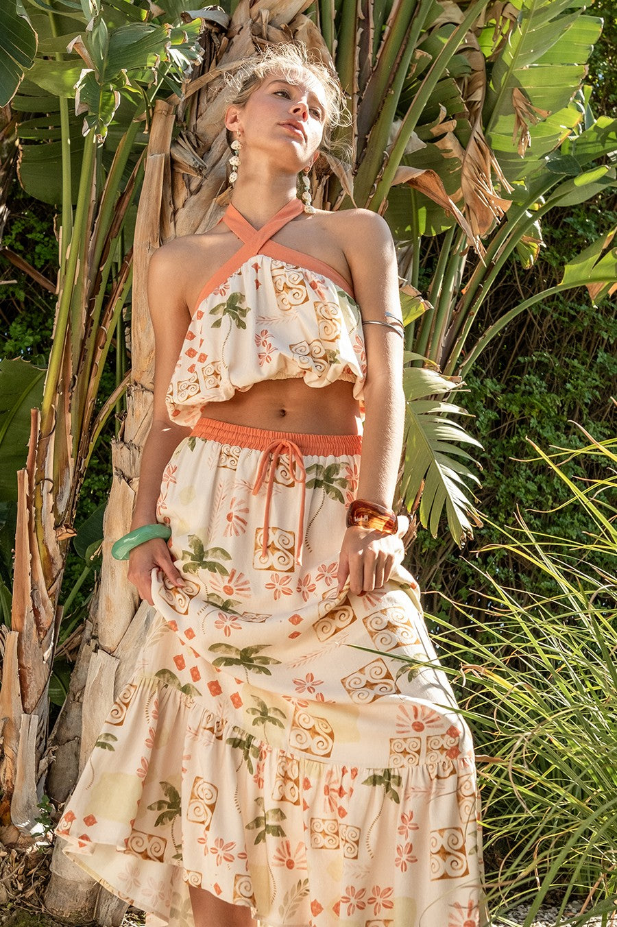 Fits true to size, model is wearing a small. Has some stretch at the waistband and an adjustable neck tie. Cropped.
