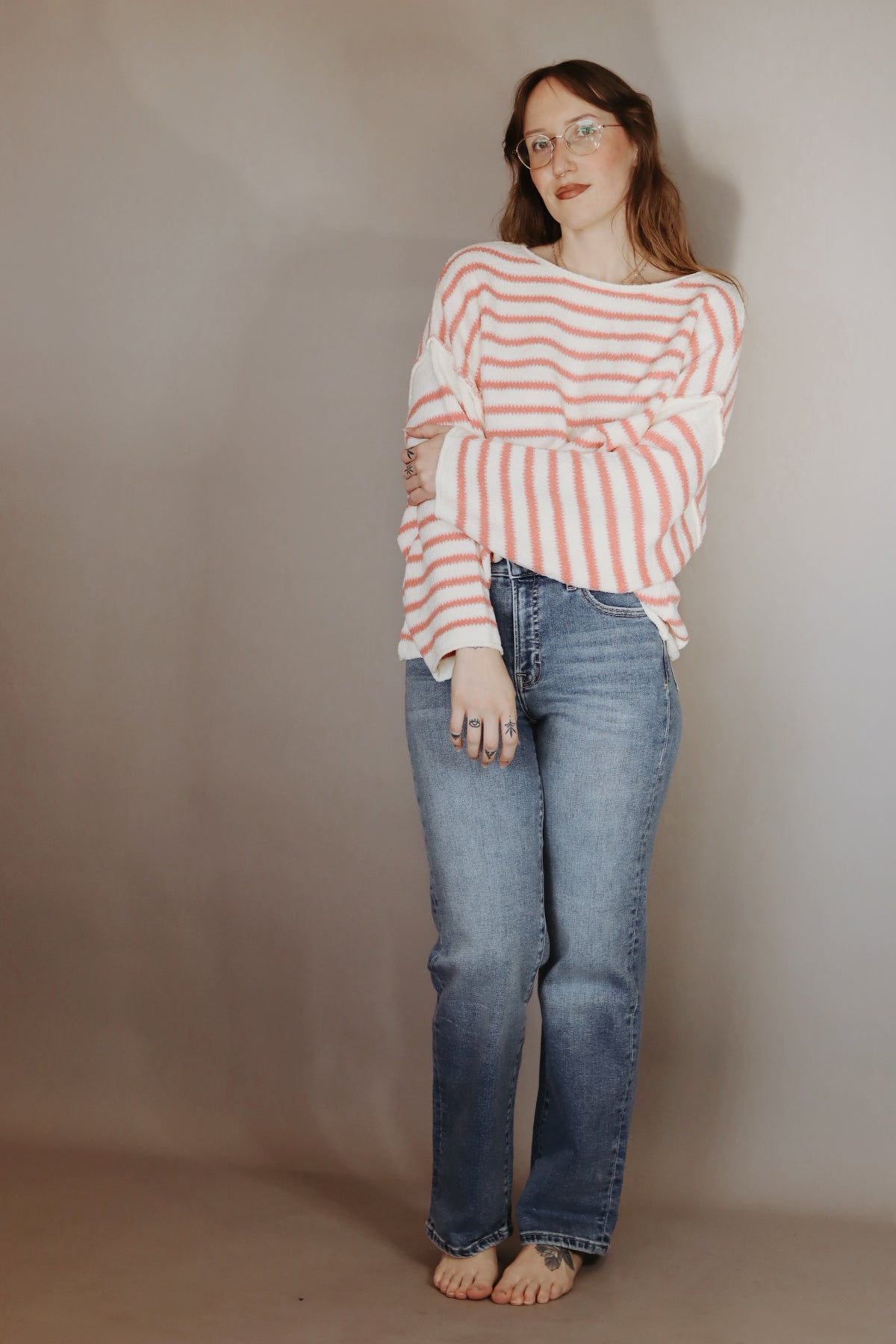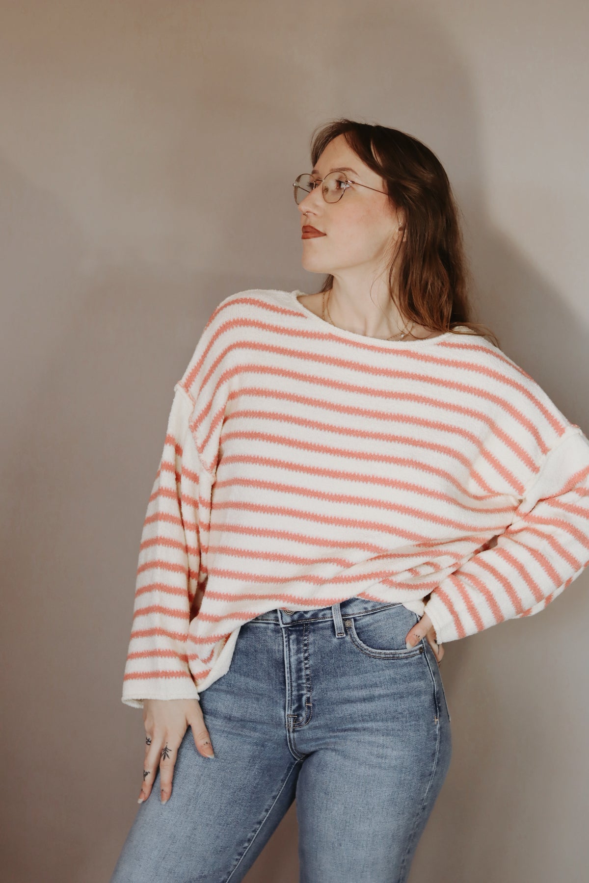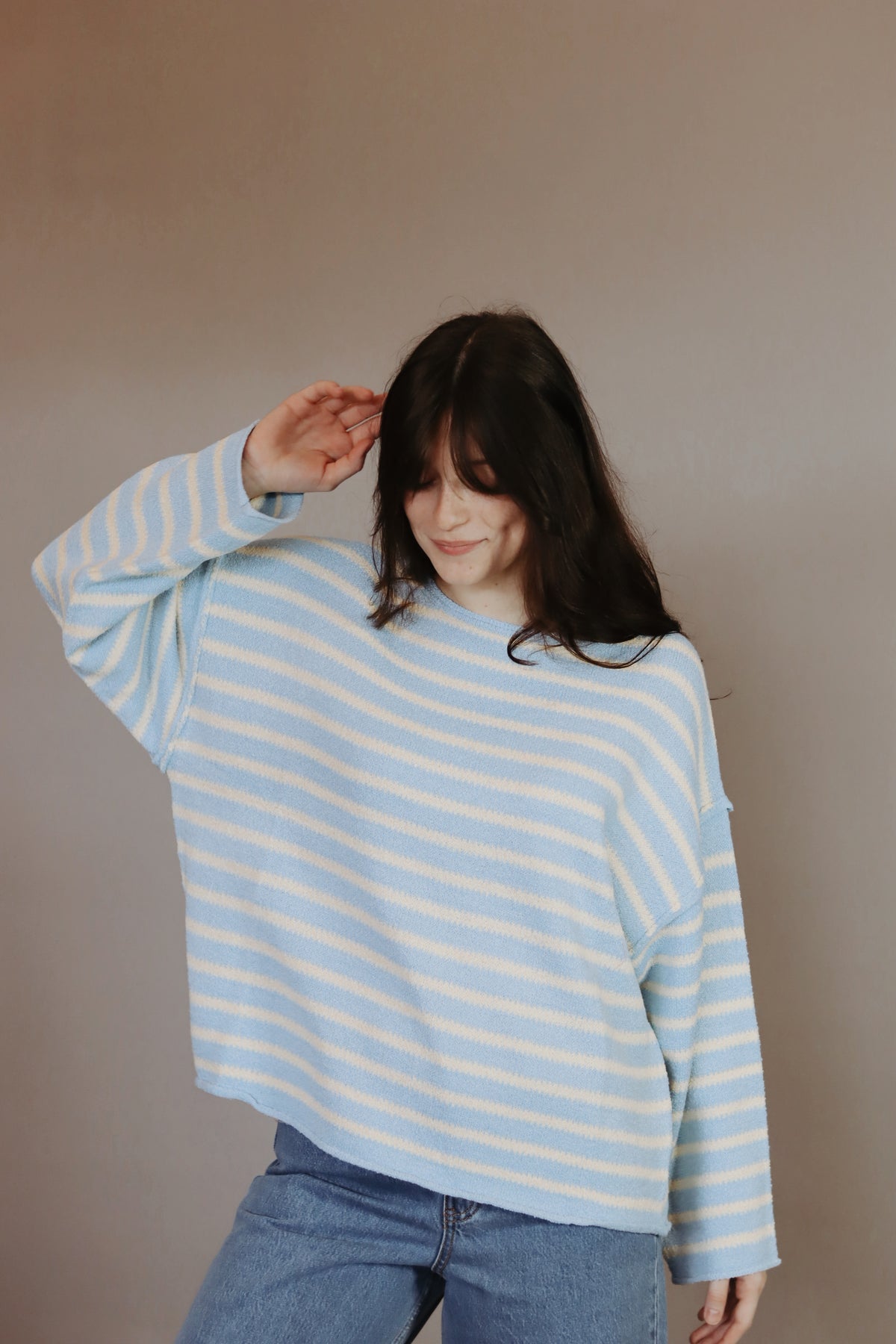 A striped textured knit sweater with the following features: Round neckline. Long sleeves. Dropped shoulder. Exposed seam detailing. Rolled neckline, cuffs, and hem. Loose fit. Model Info: Height: 5 ft 9 in | Bust: 34 in | Waist: 25 in | Hips: 36 in | Wearing Size S.