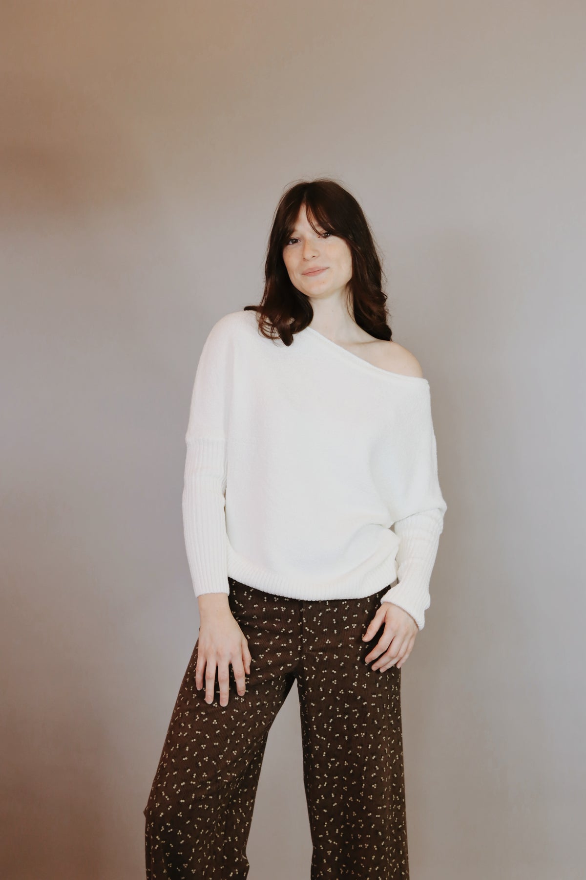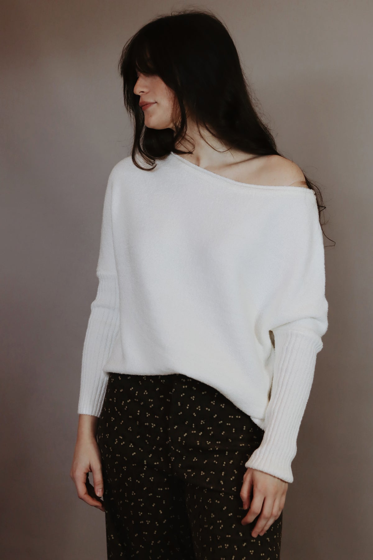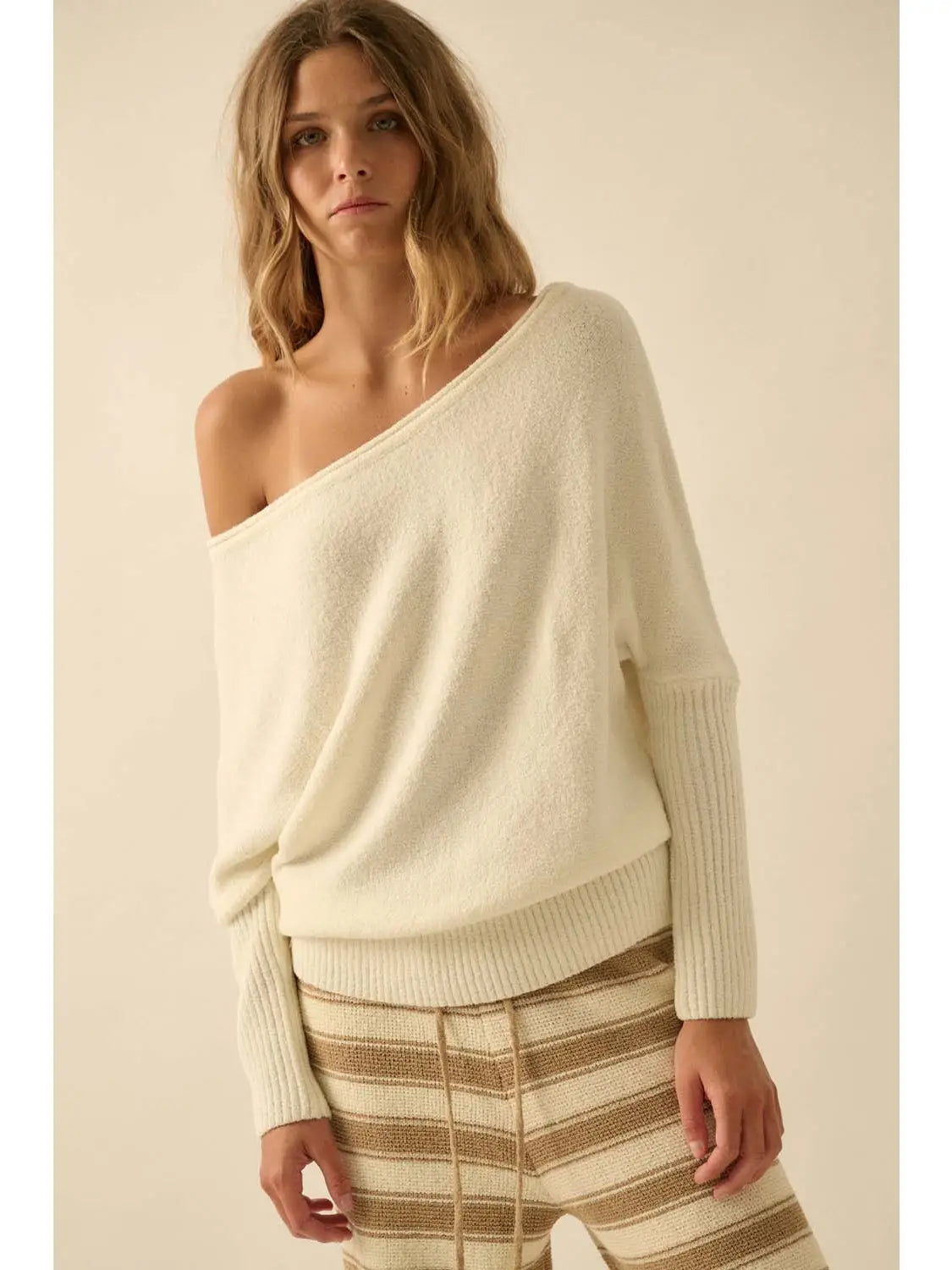 A solid, textured knit sweater with the following features: One-shoulder boat neckline. Rolled collar. Long dolman sleeves. Elbow-length cuffs. Ribbed knit cuffs and hem. Relaxed fit. * Cream 2nd cut SOLD OUT. 3rd cut ETA: 1/30/2026. Model Info: Height: 5 ft 11 in | Bust: 32 in | Waist: 25 in | Hips: 35 in | Wearing Size S.