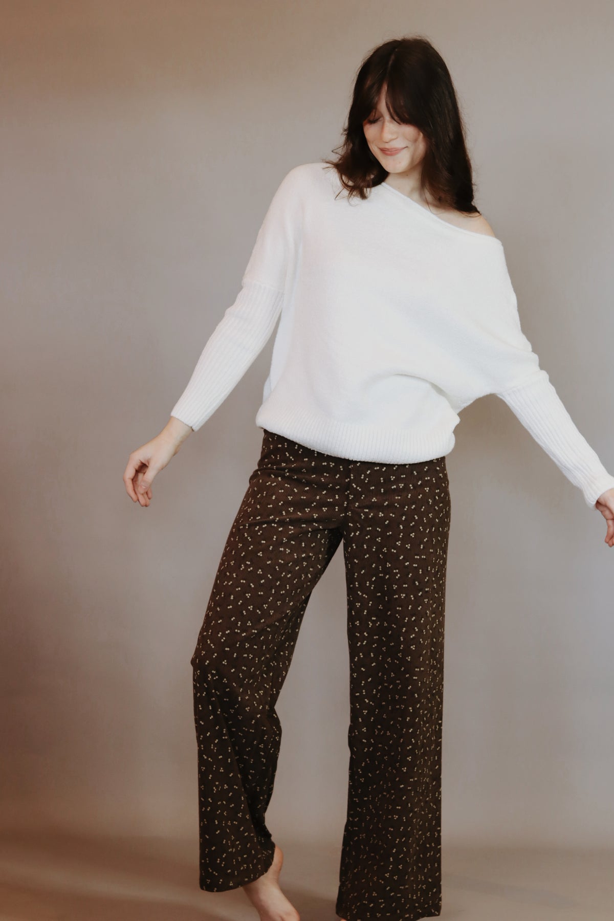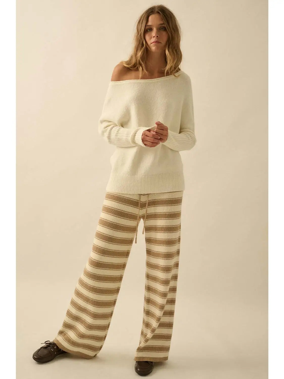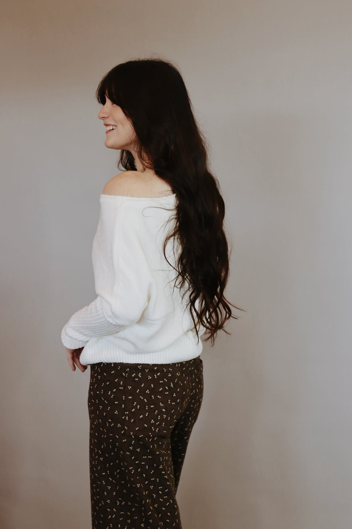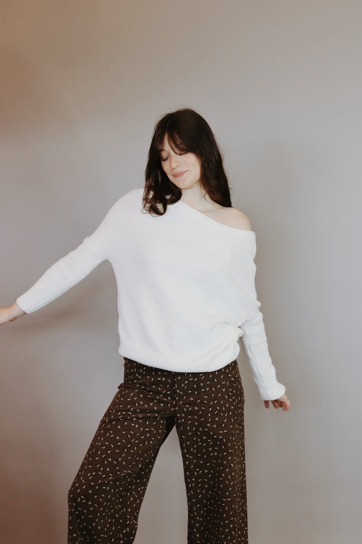 A solid, textured knit sweater with the following features: One-shoulder boat neckline. Rolled collar. Long dolman sleeves. Elbow-length cuffs. Ribbed knit cuffs and hem. Relaxed fit. * Cream 2nd cut SOLD OUT. 3rd cut ETA: 1/30/2026. Model Info: Height: 5 ft 11 in | Bust: 32 in | Waist: 25 in | Hips: 35 in | Wearing Size S.