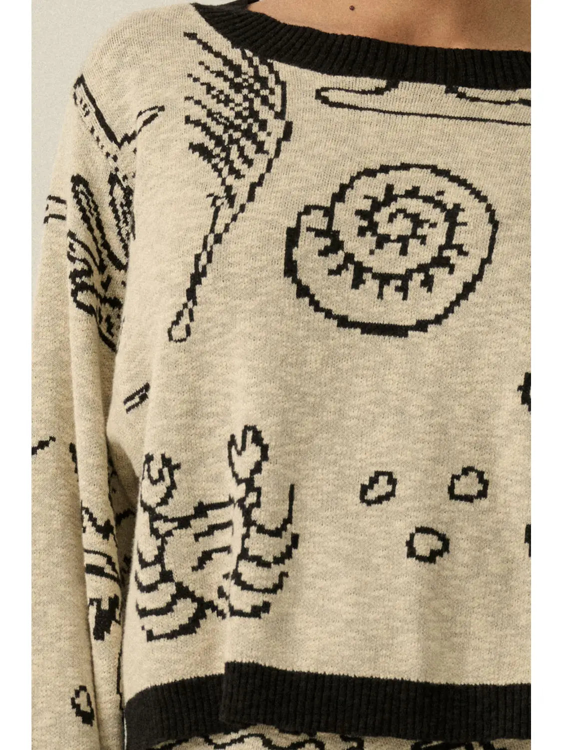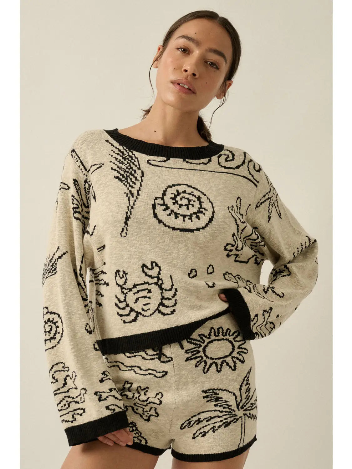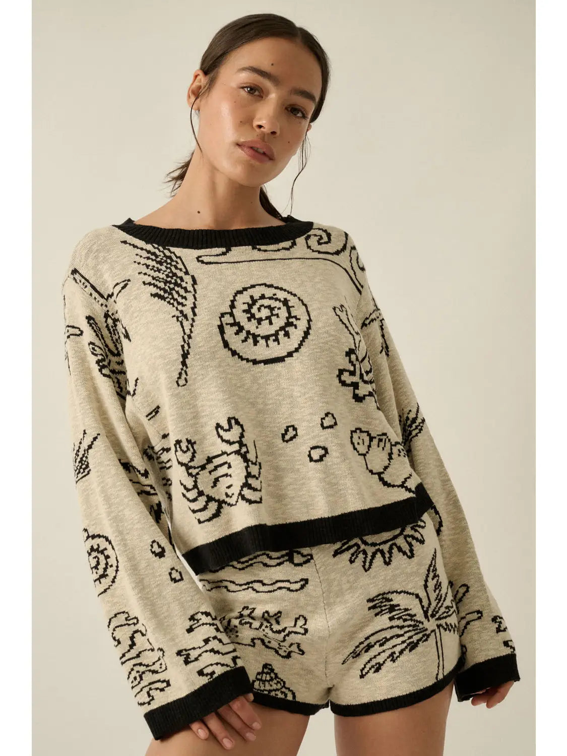 A jacquard slub knit sweater with the following features: Nautical motifs throughout with shells, palm trees, coral, and crabs. Boat neckline. Long sleeves. Exposed shoulder seams. Contrasting ribbed knit collar, cuffs, and hem. Relaxed fit. Model Info: Height: 5 ft 8 in | Bust: 35 in | Waist: 24 in | Hips: 33 in | Wearing Size S.