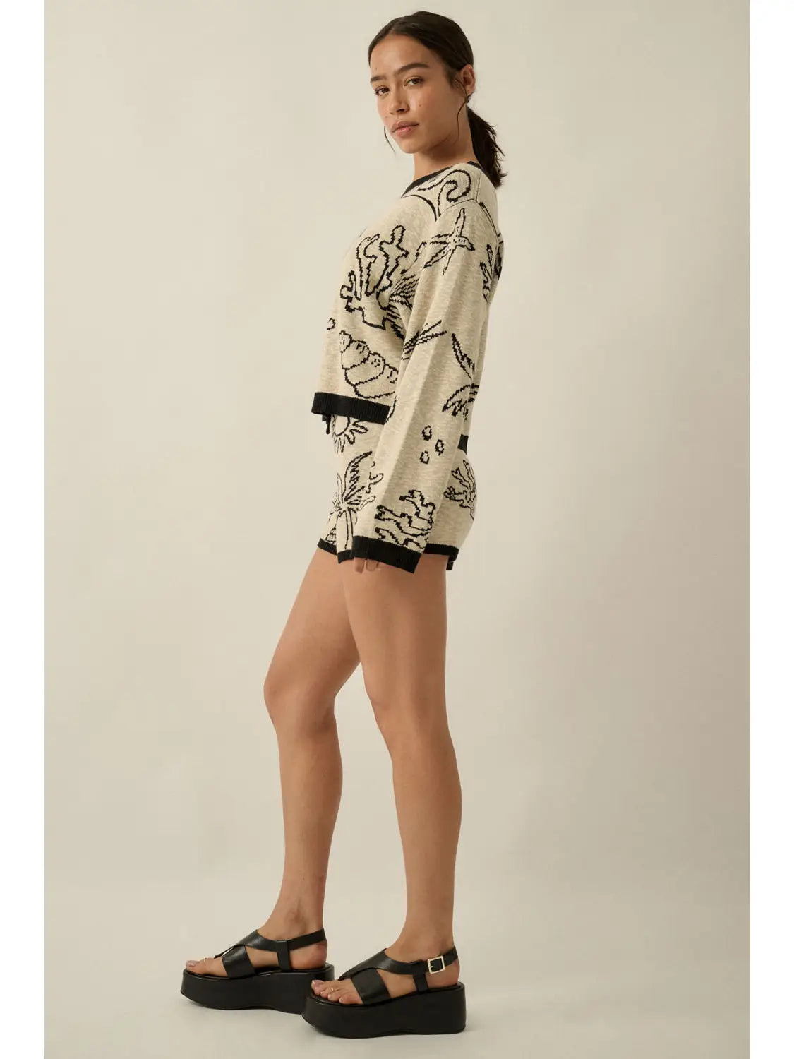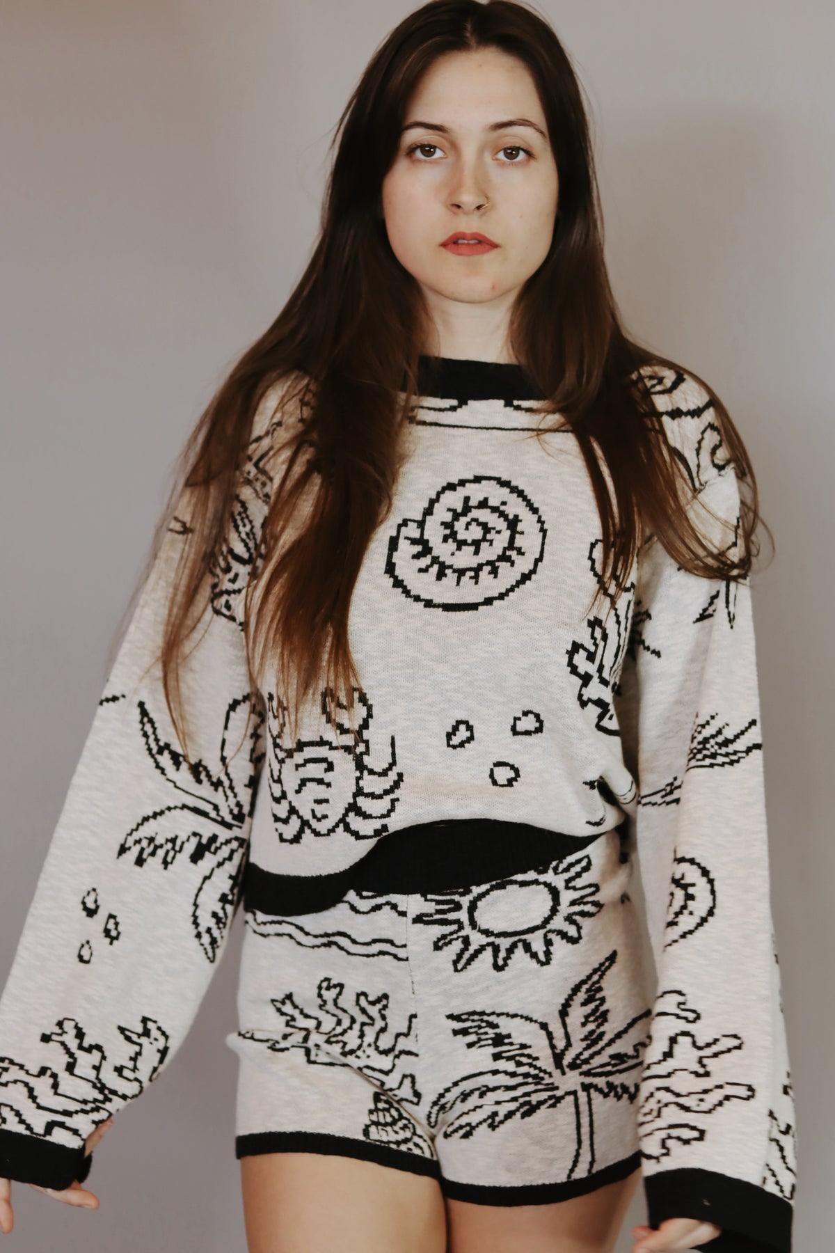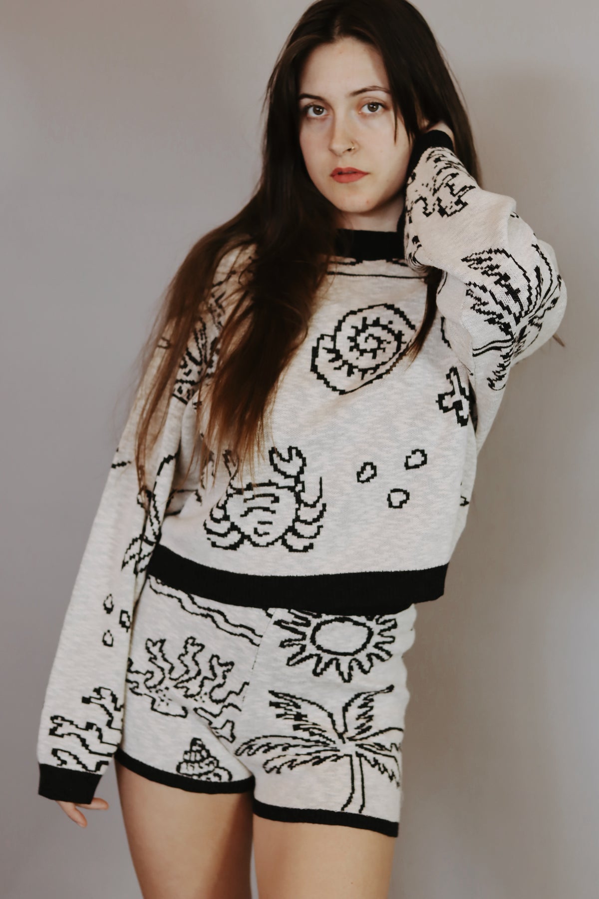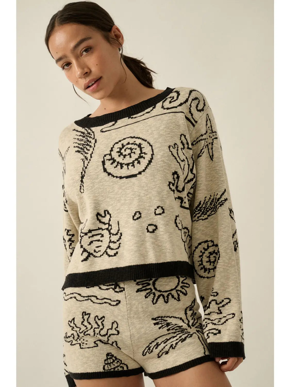 A jacquard slub knit sweater with the following features: Nautical motifs throughout with shells, palm trees, coral, and crabs. Boat neckline. Long sleeves. Exposed shoulder seams. Contrasting ribbed knit collar, cuffs, and hem. Relaxed fit. Model Info: Height: 5 ft 8 in | Bust: 35 in | Waist: 24 in | Hips: 33 in | Wearing Size S.