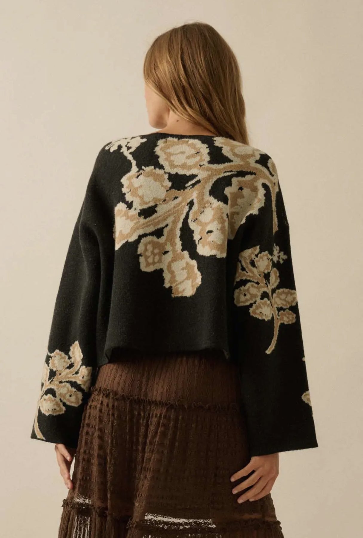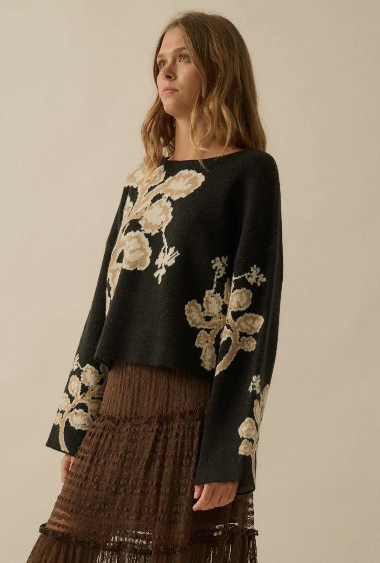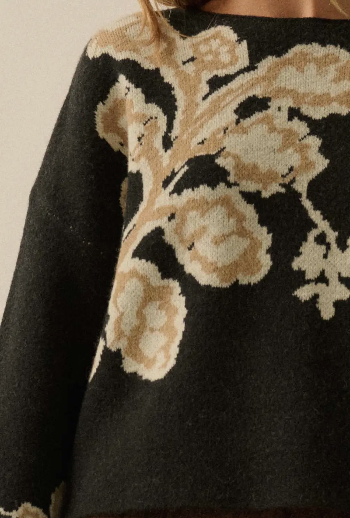 Floral Jacquard Knit Wide Sleeve Boat Neck Sweater