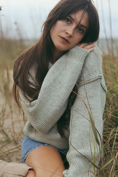 A solid knit sweater with a round neckline and drop shoulder. Fits true to size, model is wearing size small.